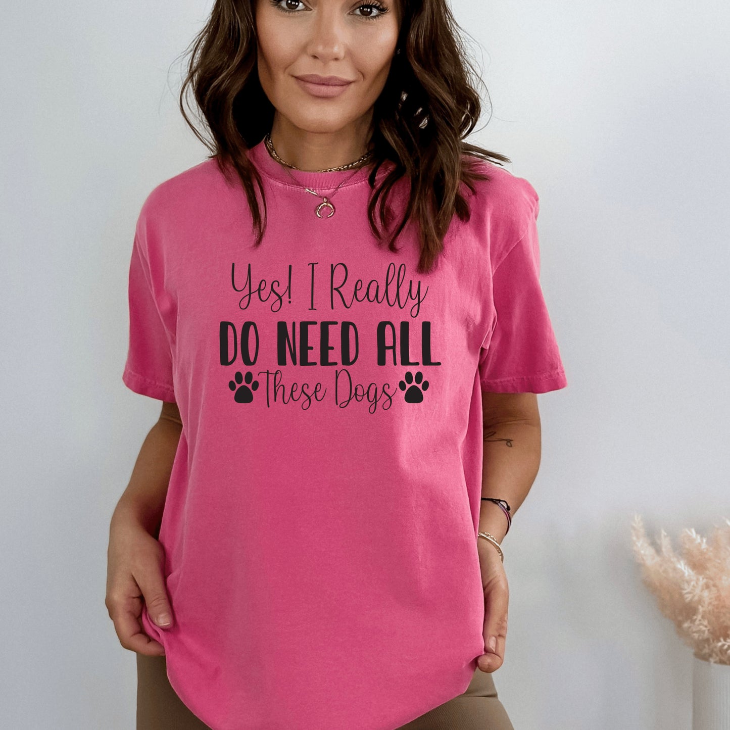 Introducing the Comfort Color Dog Mom Shirt, a must-have for every dog lover! This playful t-shirt features the fun phrase 'Yes I Really Do Need All These Dogs,' perfect for showcasing your love for furry friends.