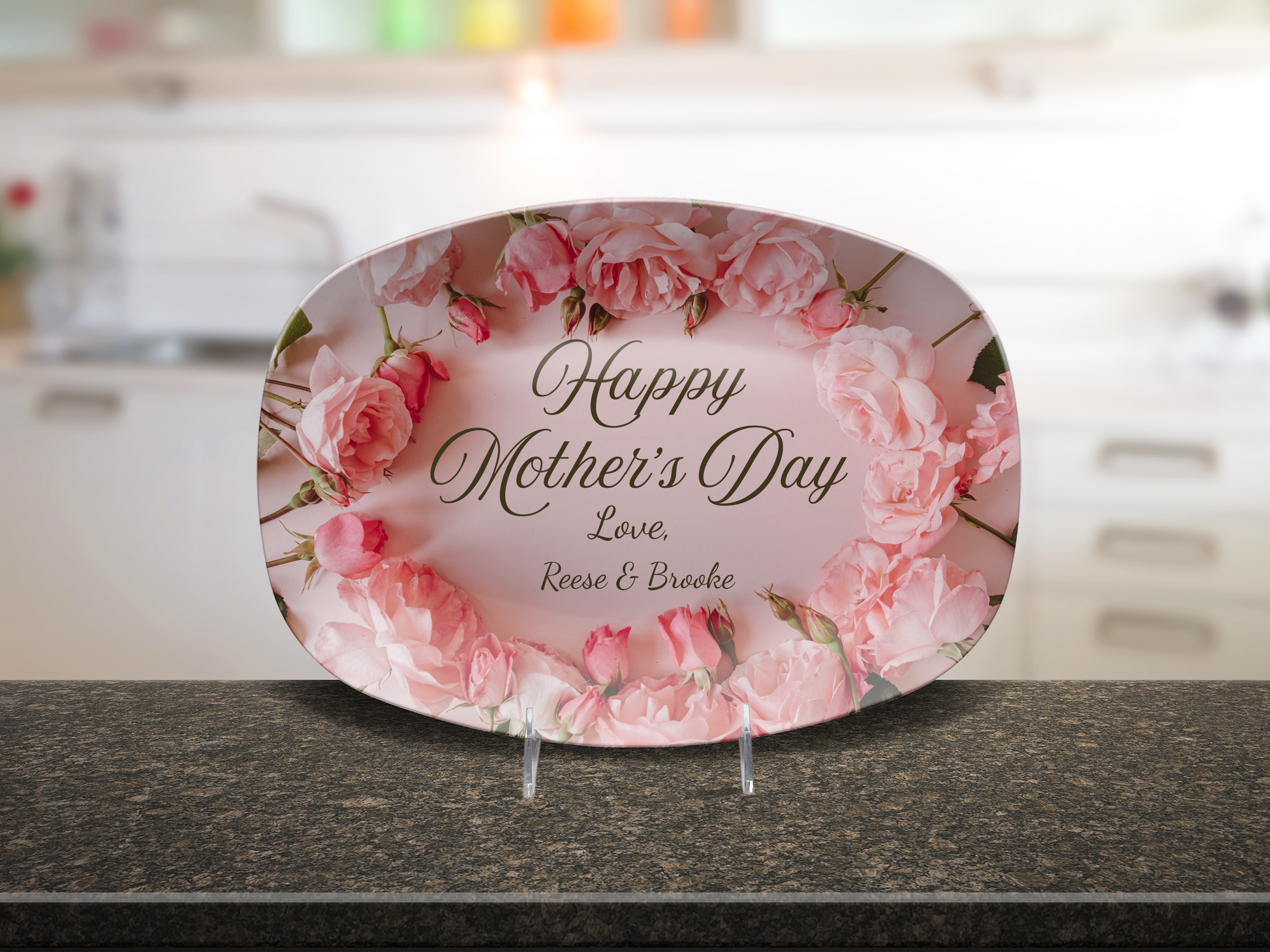 Celebrate Mom with a timeless and elegant gift! This beautiful platter features delicate pink roses on a soft pink background, framing the heartfelt message “Happy Mother’s Day.” Add a personal touch by including kids' or grandkids' names, making it a truly unique keepsake she’ll treasure forever.