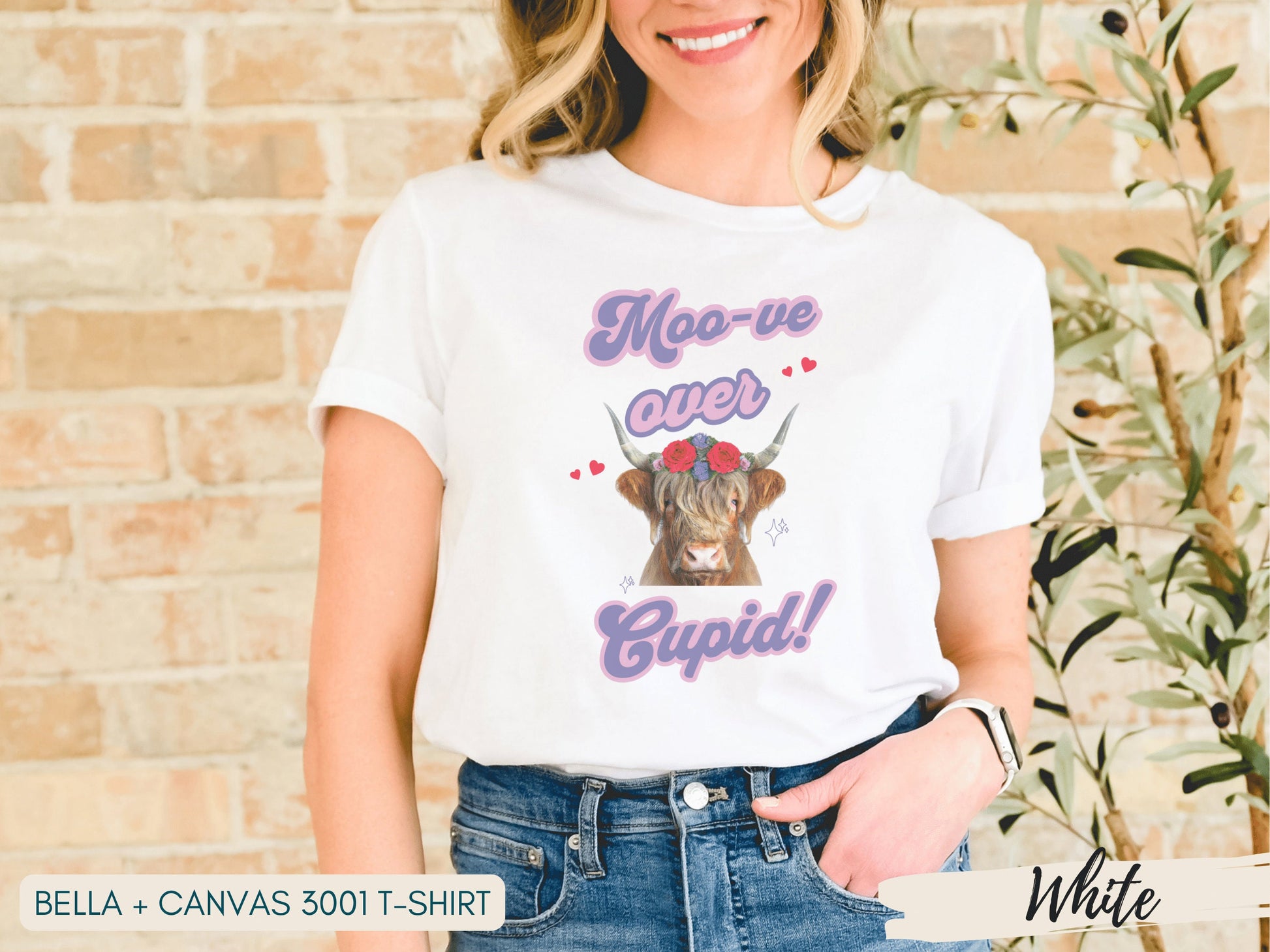 The playful design includes the phrase 'Moo-ve over Cupid,' surrounded by hearts, making it a delightful choice for cow lovers. Available in high-quality, 100% cotton t-shirts, long-sleeve shirts, and sweatshirts, there’s a style for everyone.