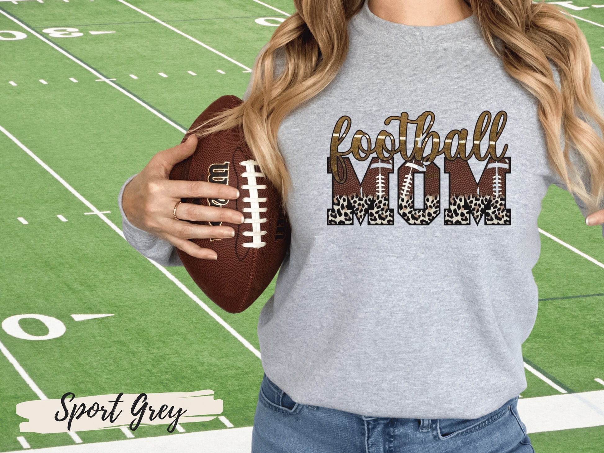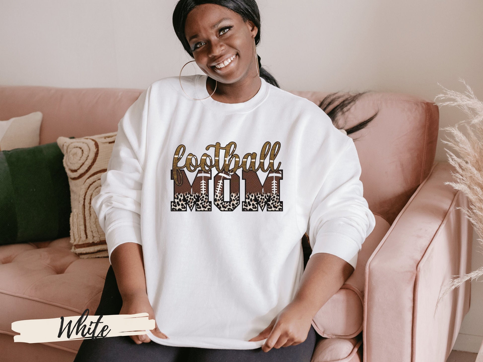 Featuring a unique design, the sweatshirt showcases a hide leather football nestled within the word 'MOM,' adorned with a chic leopard print. It's not just a piece of clothing; it's a statement of love for both football and fashion.