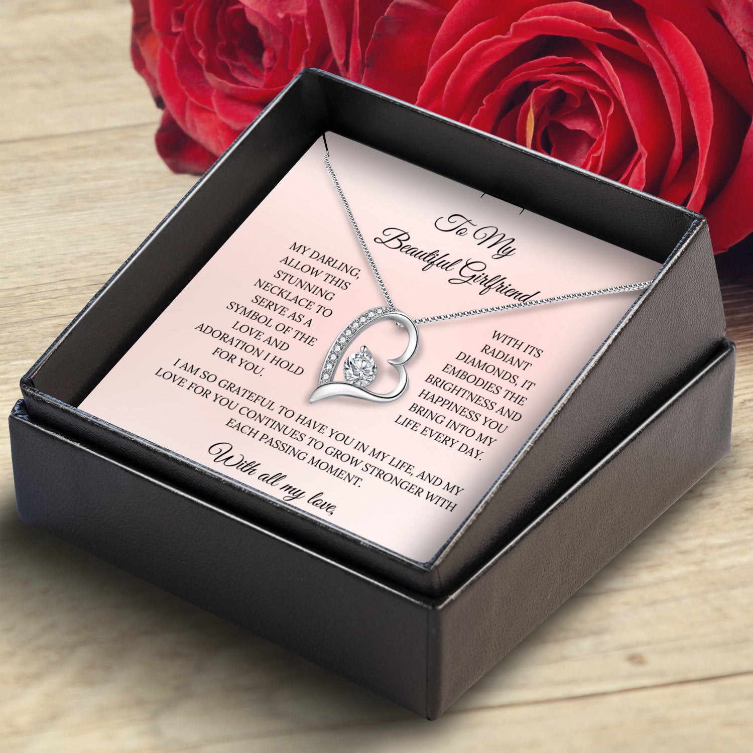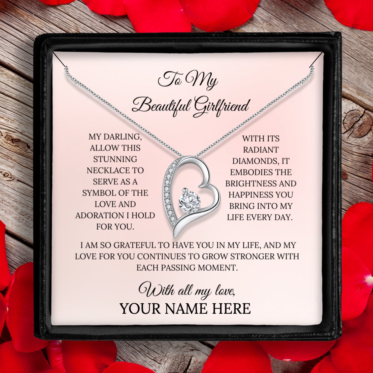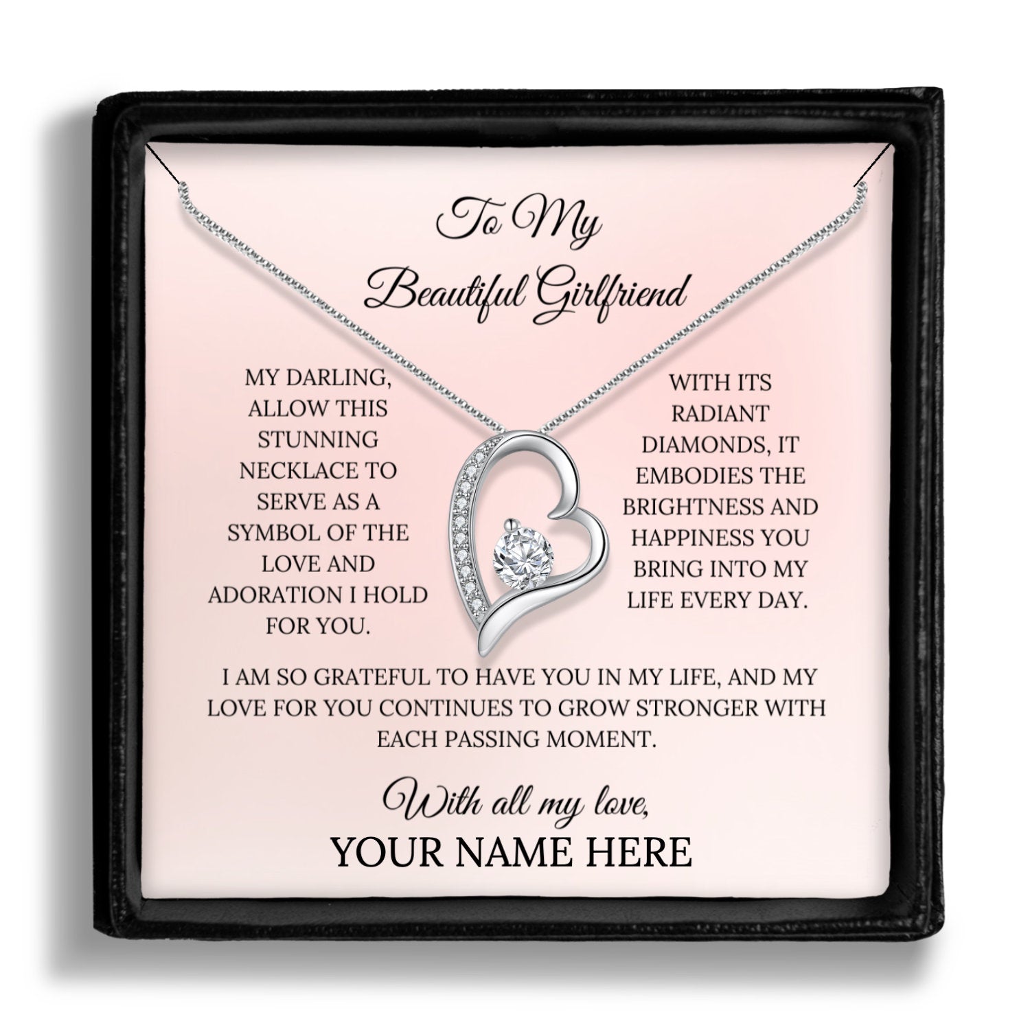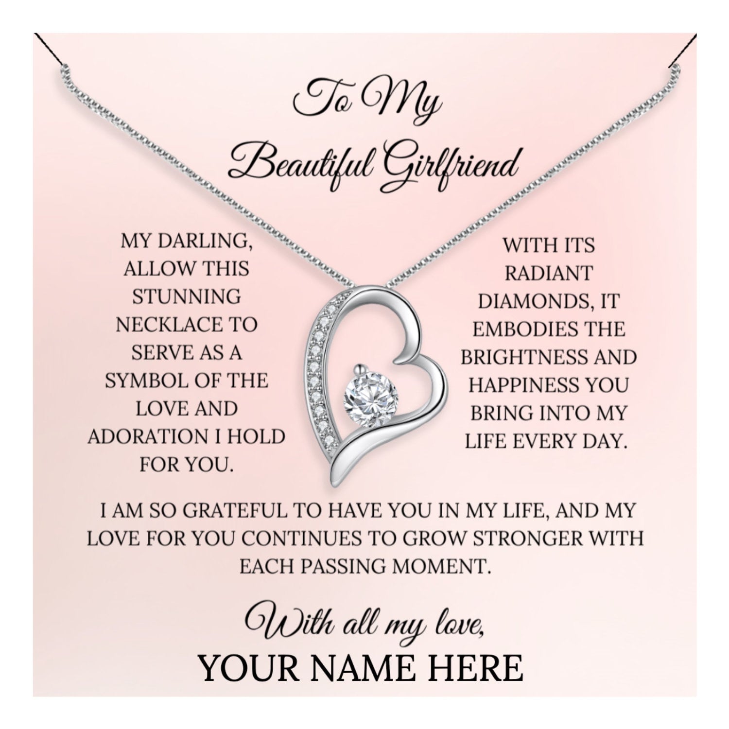 Featuring a beautiful heart pendant, accented by a dazzling cubic zirconia that captures the light with every movement, this necklace is a true expression of your love and affection. The gift includes a personalized message card, allowing you to add your own special touch to the present. Whether for a birthday, anniversary, or simply to show your appreciation, this necklace is the perfect choice.