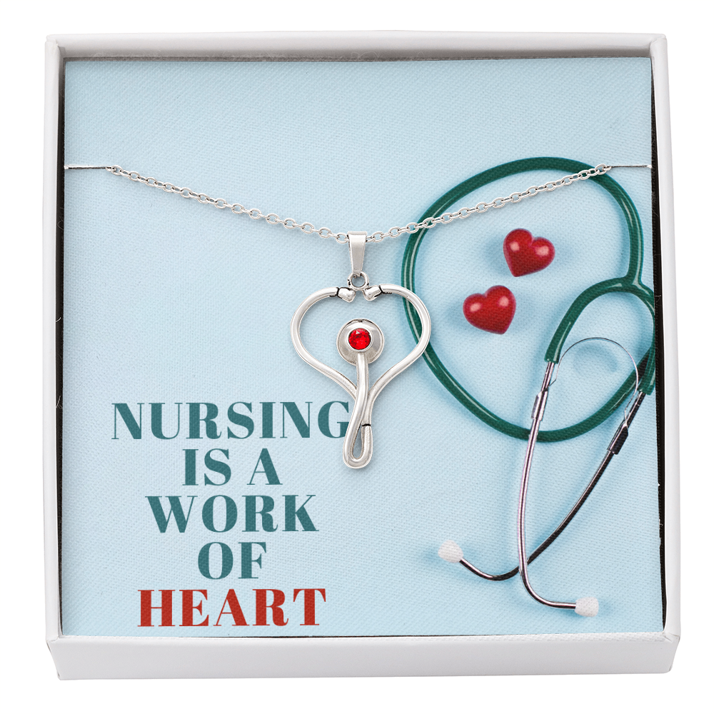 The heart shaped Stethoscope design is crafted from polished stainless steel and features a red Swarovski® Crystal at the center, symbolizing the love and care they provide day to day. Includes an adjustable cable chain that measures 18"-22" with a lobster clasp closure.