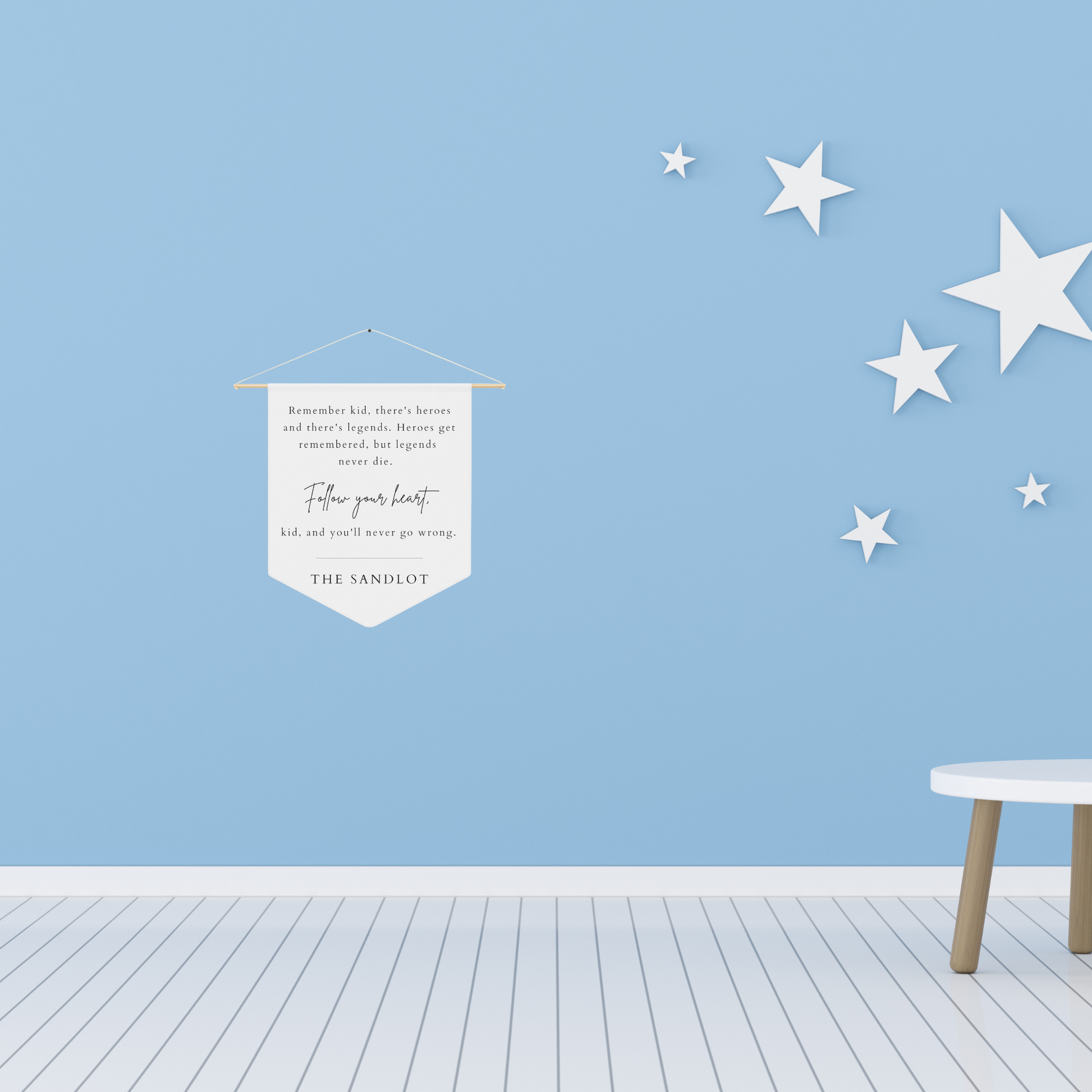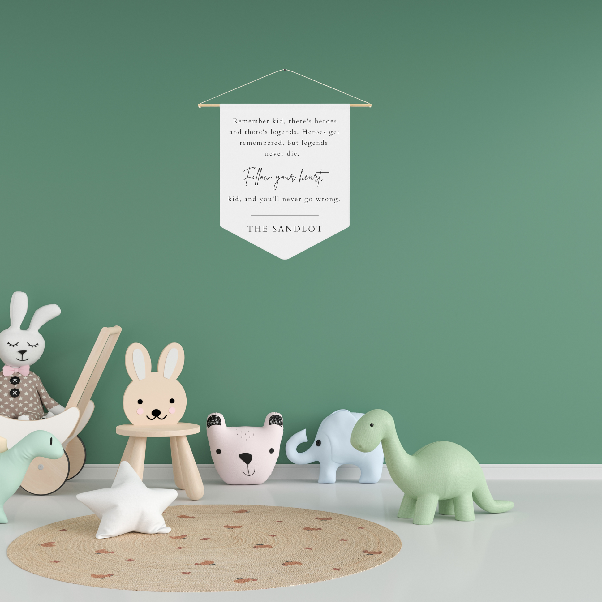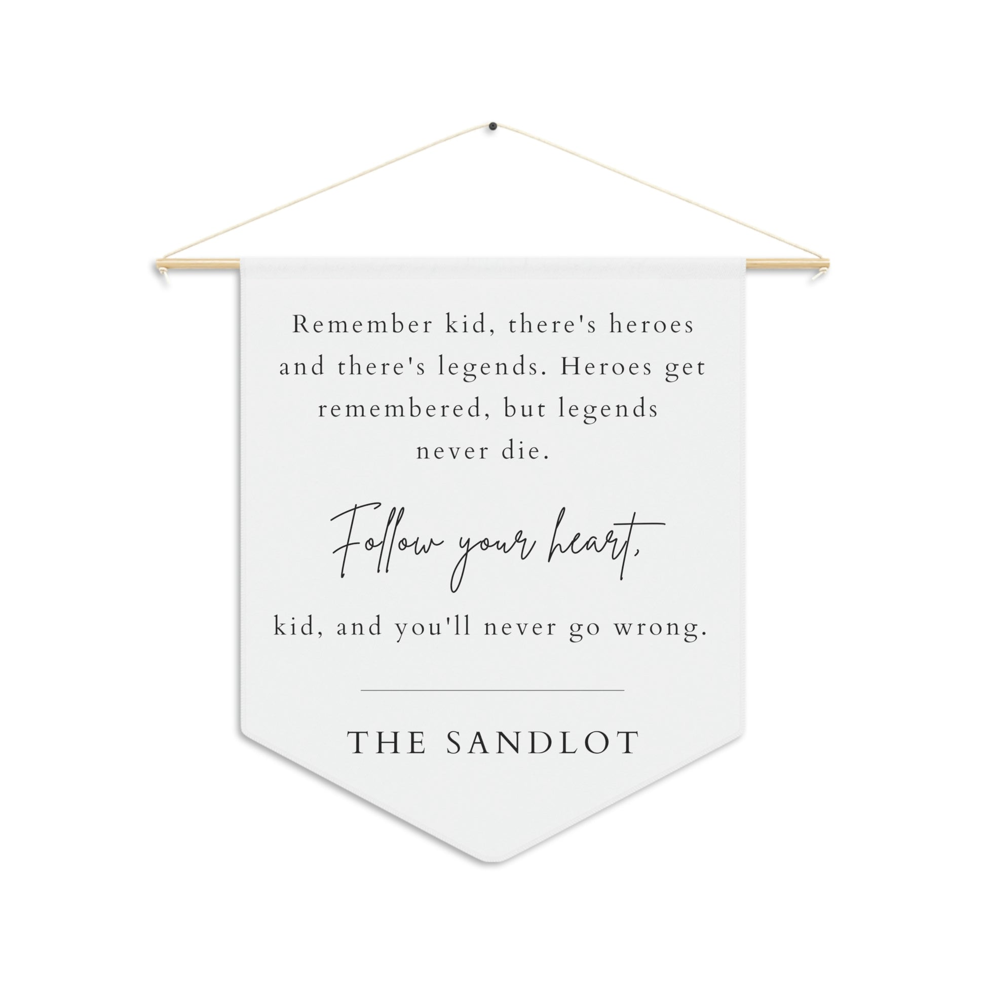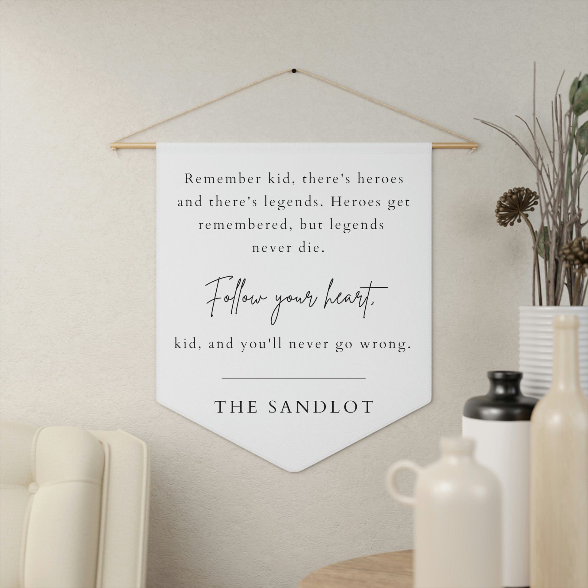 Enhance your nursery, playroom, or kids' room with our charming banner featuring the beloved quote from "The Sandlot." Made from durable Poly Twill and complete with a wood dowel and twine frame, it's a hassle-free way to add whimsy and inspiration to any space. Bring home this delightful decor piece and let the magic of "The Sandlot" come to life in your home.