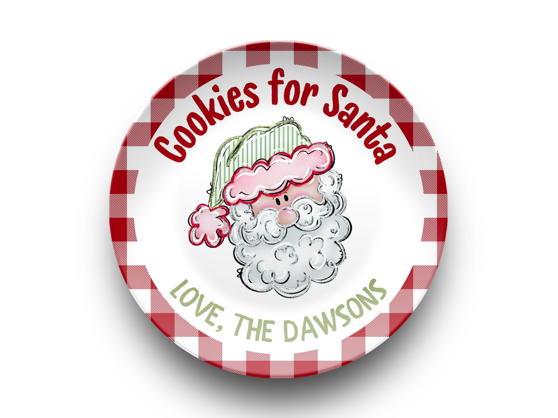 Make Christmas Eve even more magical with our Personalized "Cookies for Santa" Plate, featuring a classic red gingham border and your choice of two charming Santa styles!