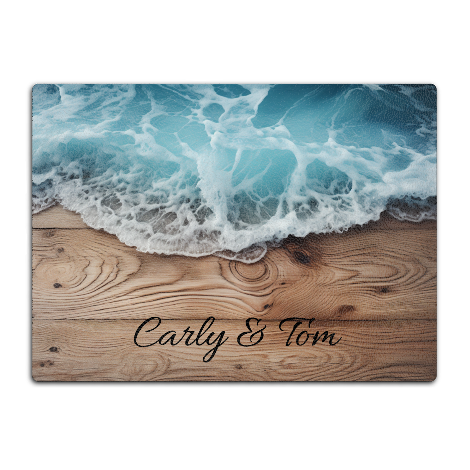 Elevate your culinary experience with our personalized glass cutting boards, featuring a captivating wooden design with ocean foam accents. Bring a touch of personalization and beauty to your kitchen or surprise someone special with a truly unique and customized gift.