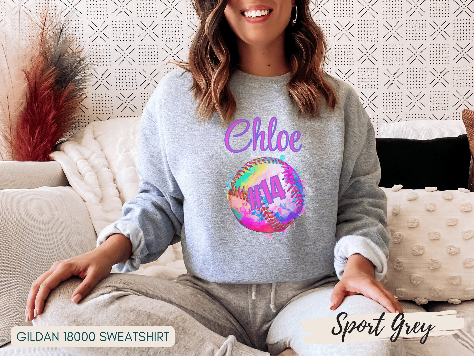 Introducing our personalized softball shirts! Show off your love for the game in style with a unique shirt featuring a center-placed softball design with a vibrant watercolor splash, and your own player name.