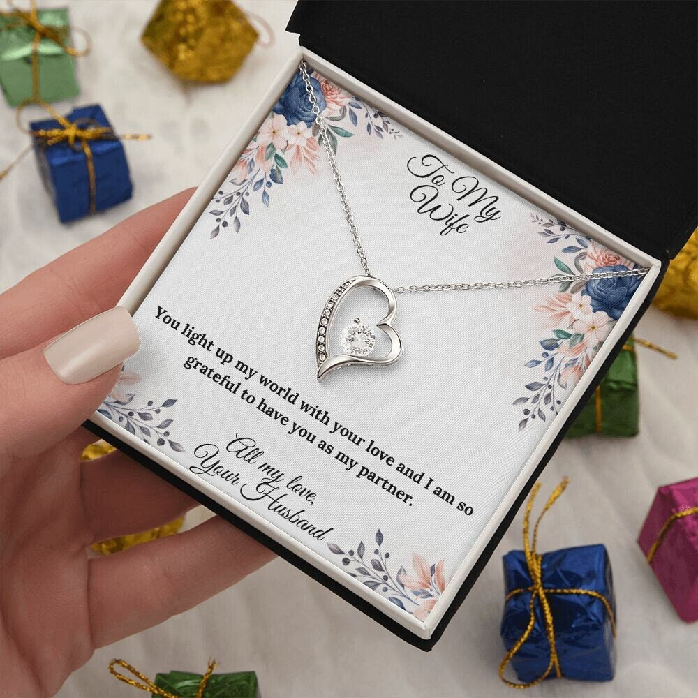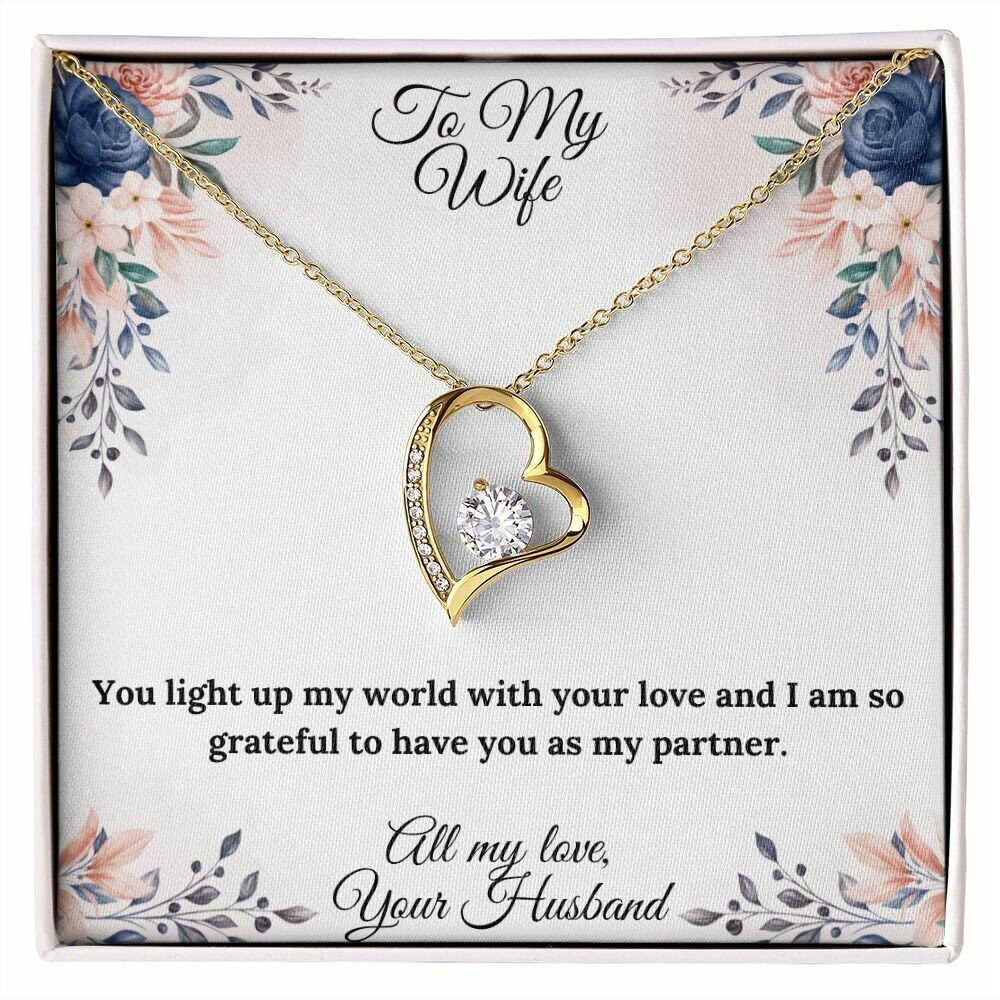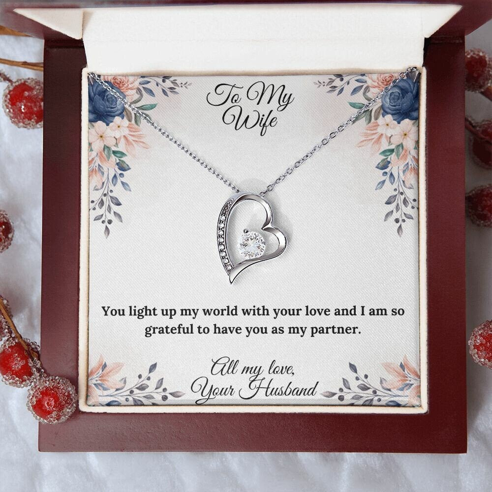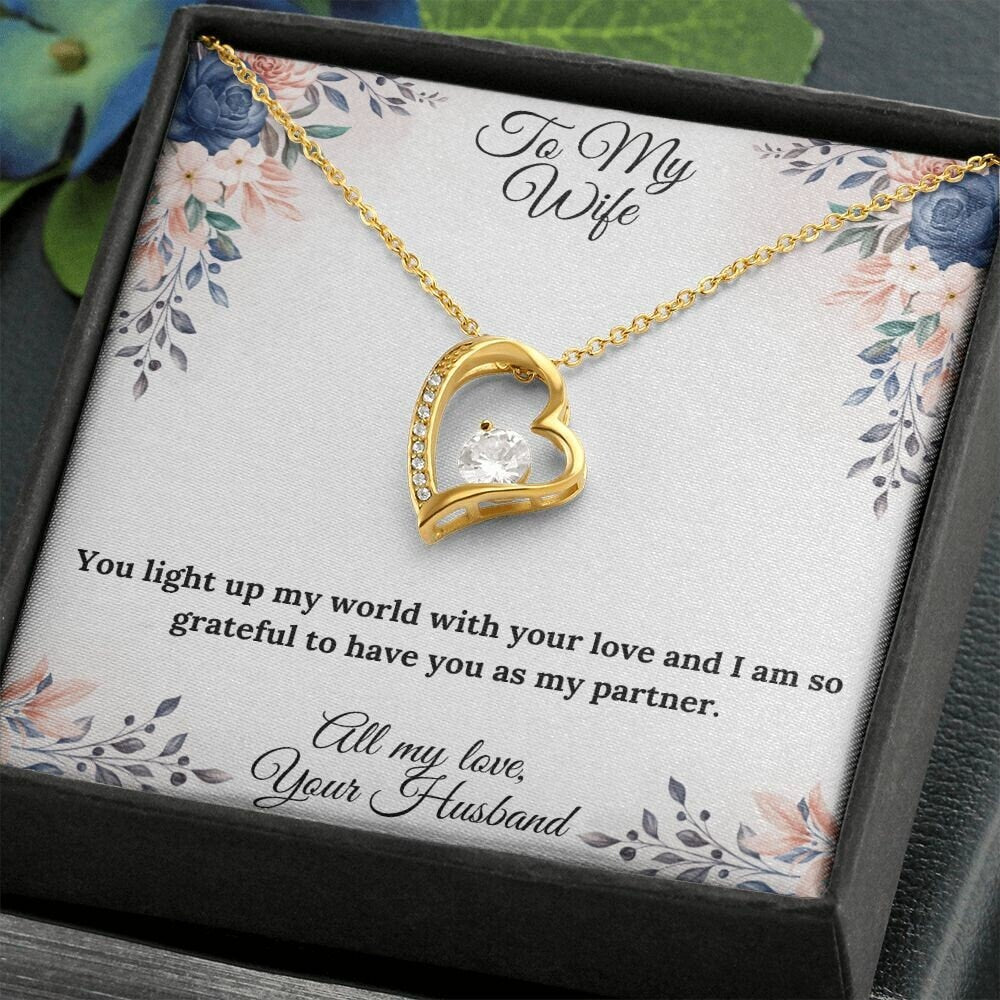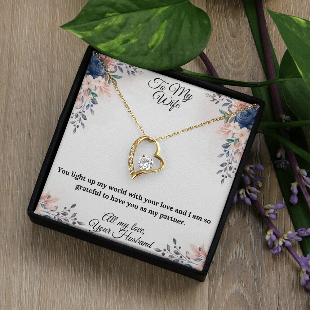 This beautiful heart necklace is crafted with a sparkling cubic zirconia and available in both silver and gold. It comes with a heartfelt message card that reads, "You light up my world with your love and I am so grateful to have you as my partner."
