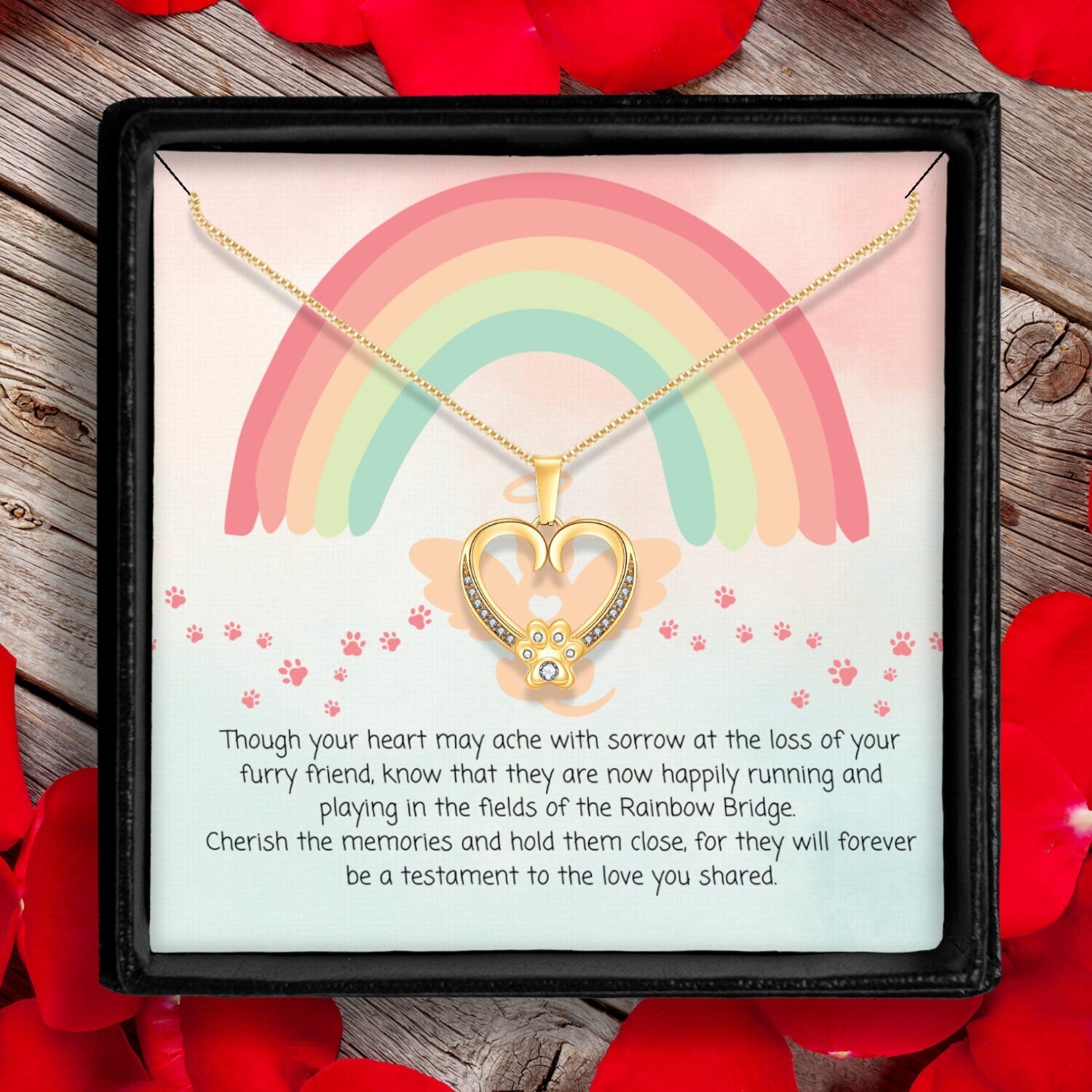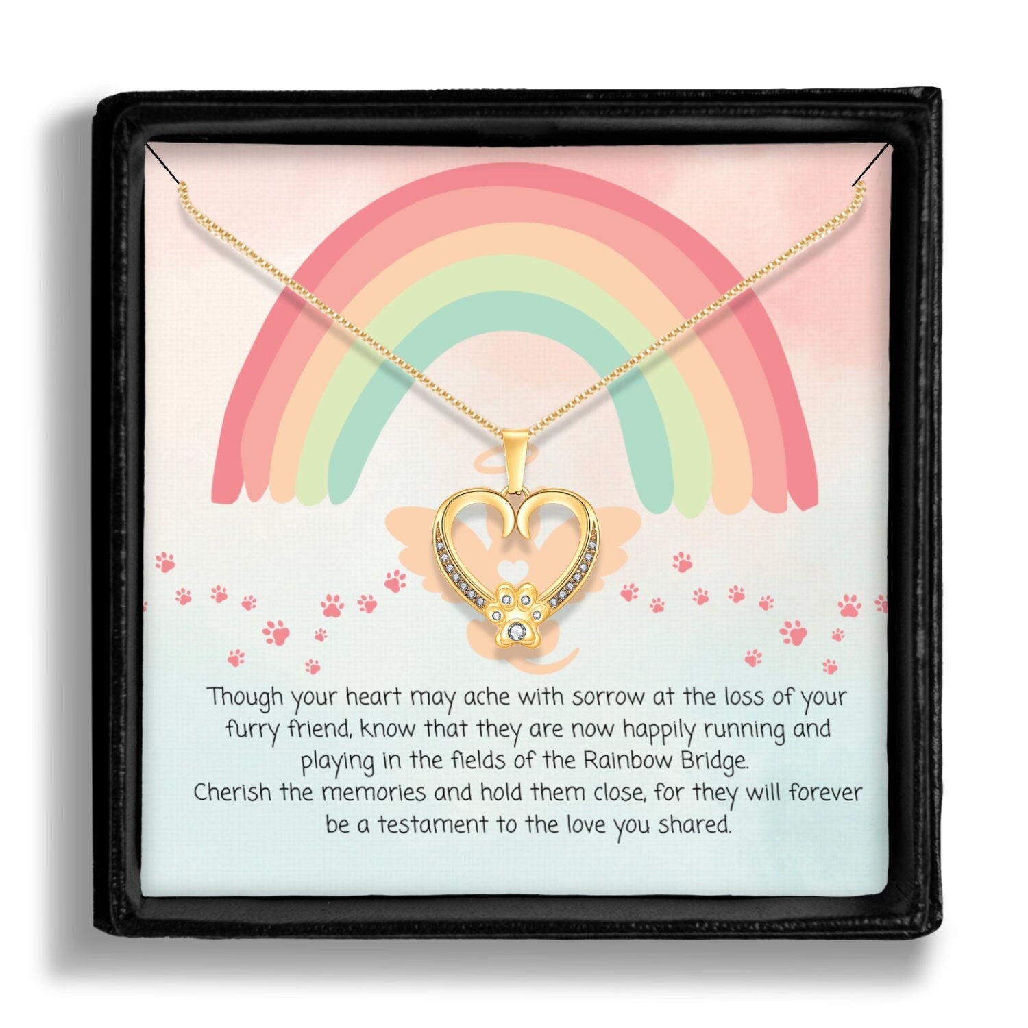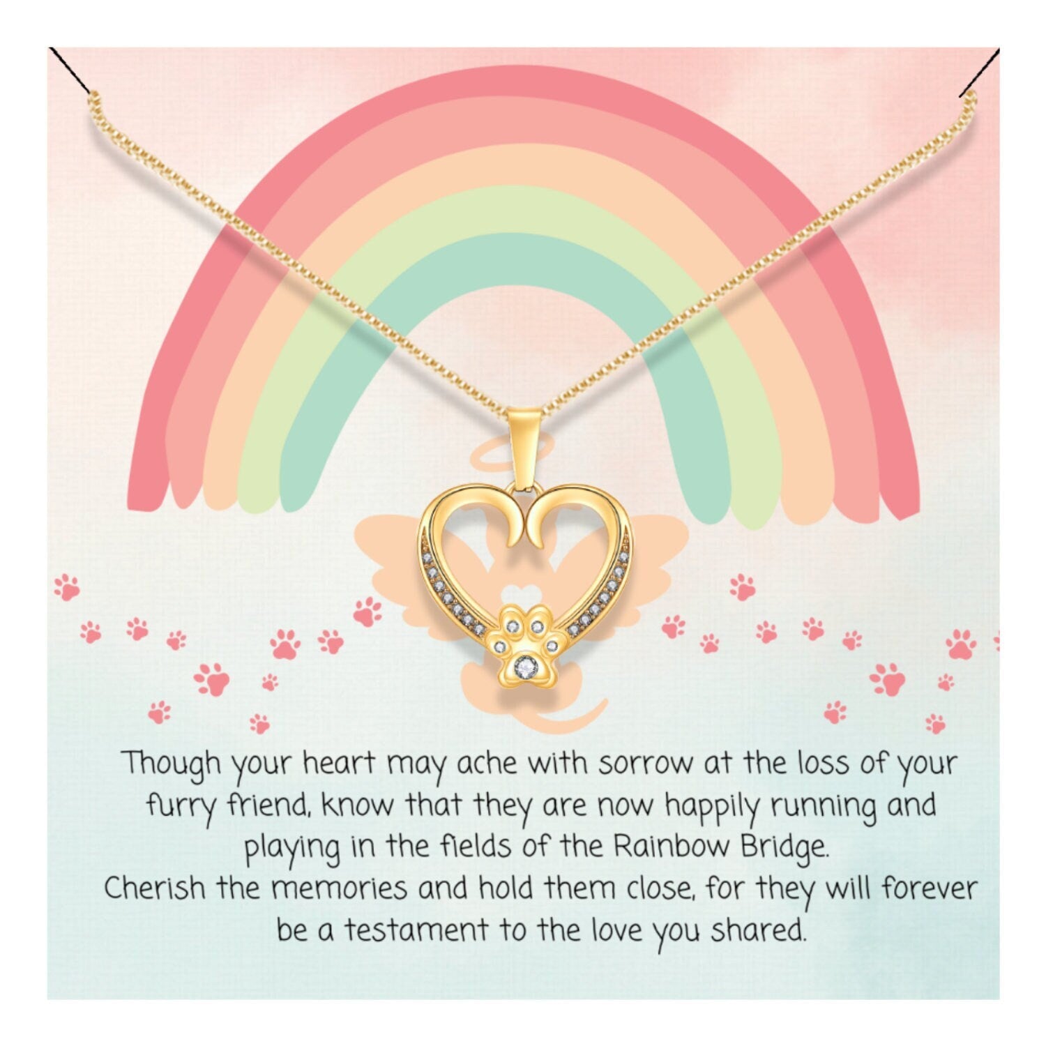 May the cherished memories of your furry friend bring you comfort," offers a message of hope and comfort. This pendant necklace is the perfect way to let someone know that you are there for them and that their furry friend will always be remembered. The gold chain adds a touch of elegance, making this necklace a beautiful keepsake to cherish for years to come.
