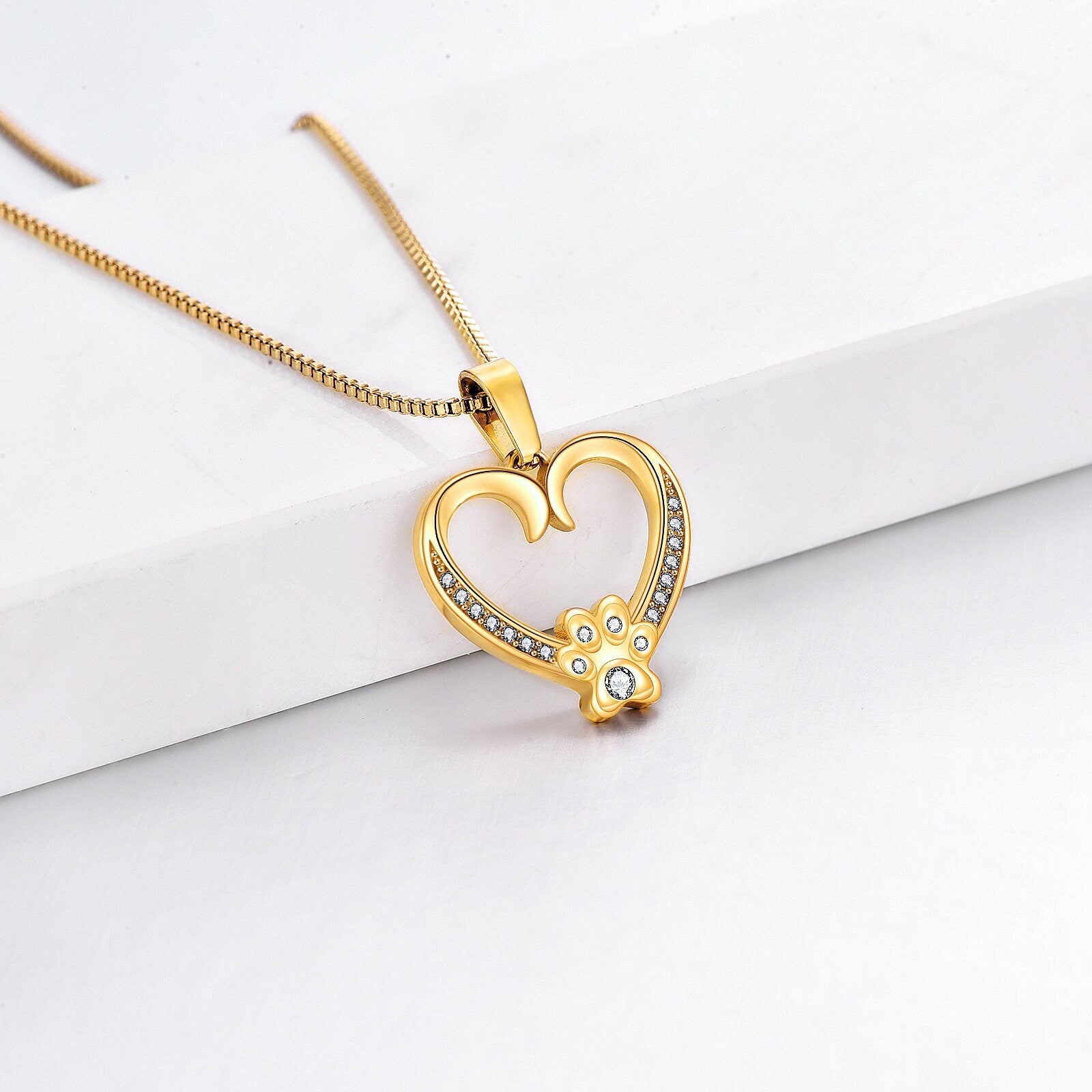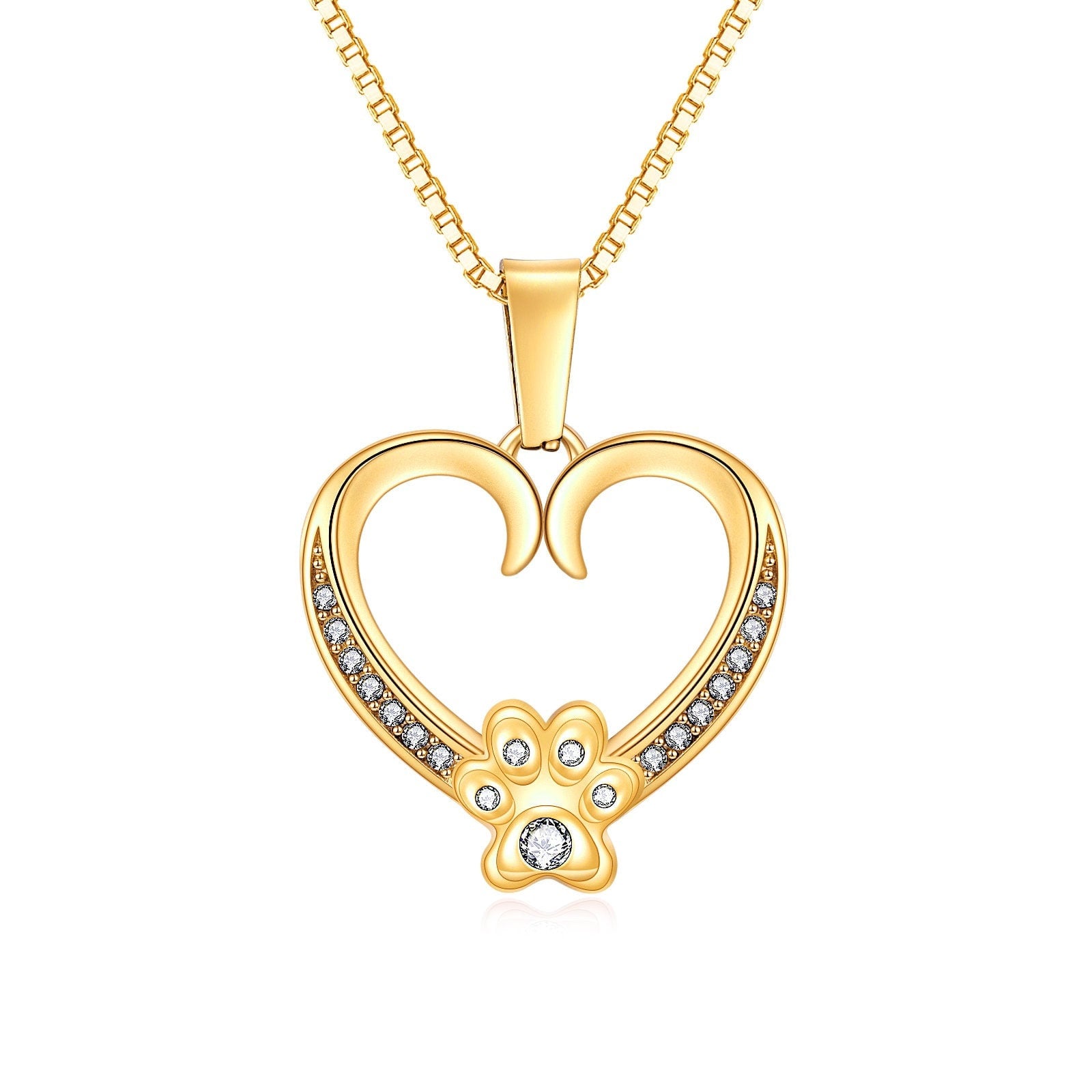 The Paw Heart Pendant is beautifully crafted from 24k gold over stainless steel, incorporating a beautiful heart embedded with Cubic Zirconia crystals that flows into a subtly crafted paw.