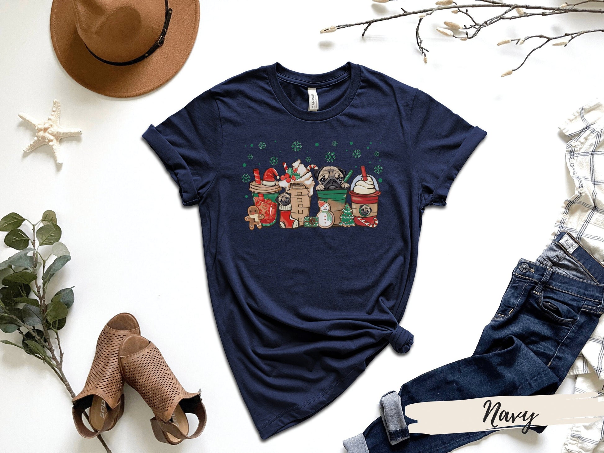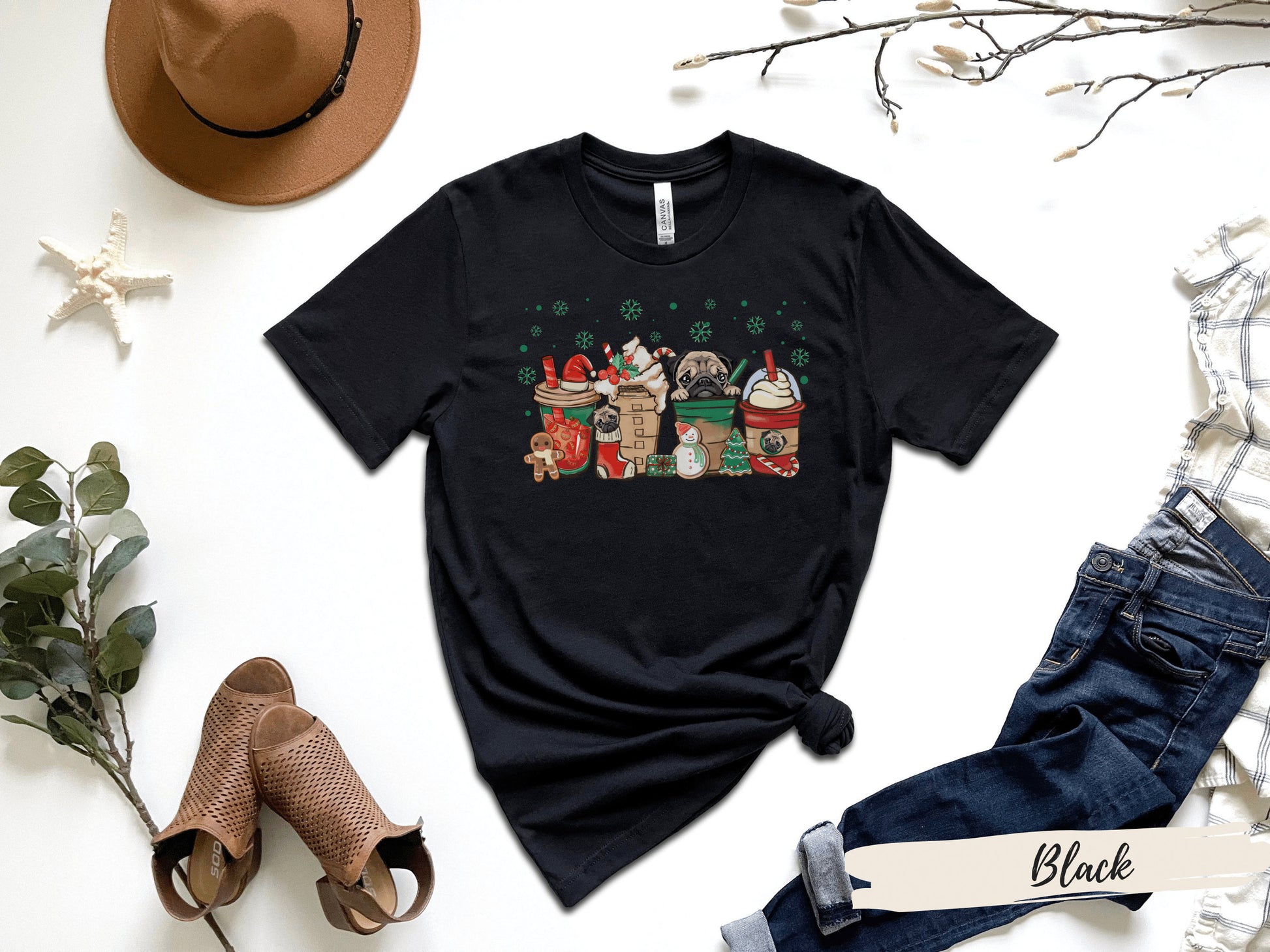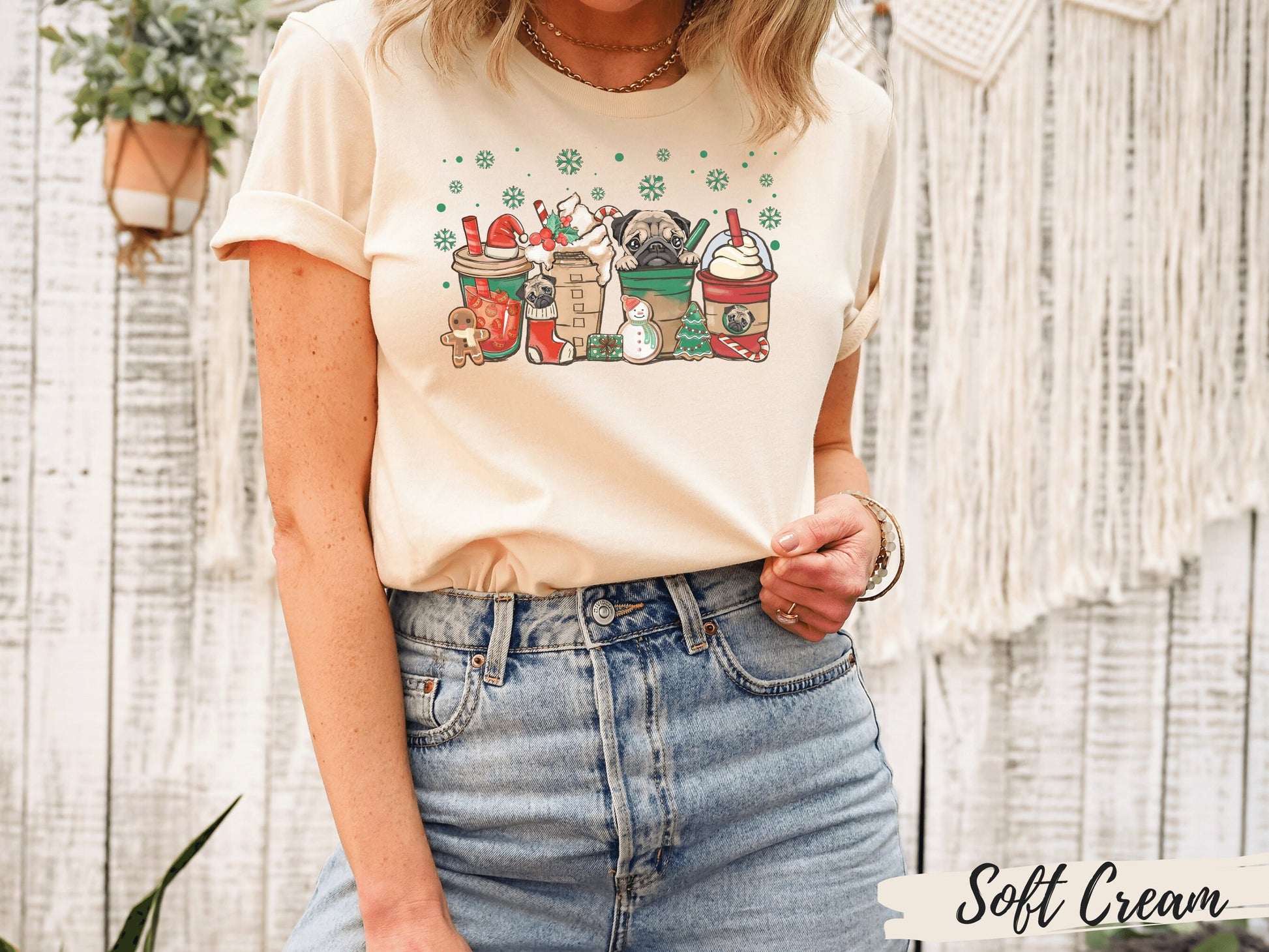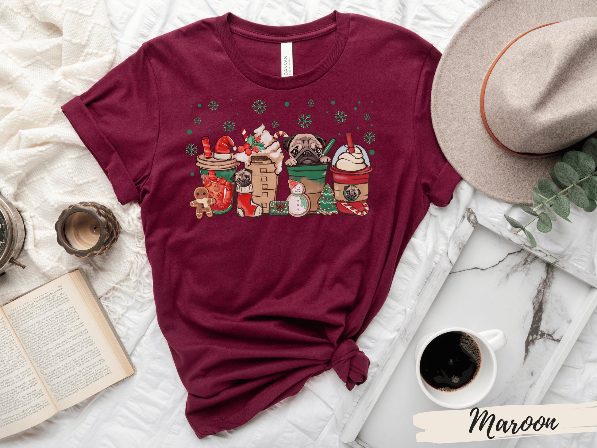 Whether you're sipping coffee at home or heading out for holiday festivities, this shirt is a delightful choice. It makes an excellent gift for dog moms and coffee enthusiasts alike, ensuring that your love for pugs shines through this festive season.
