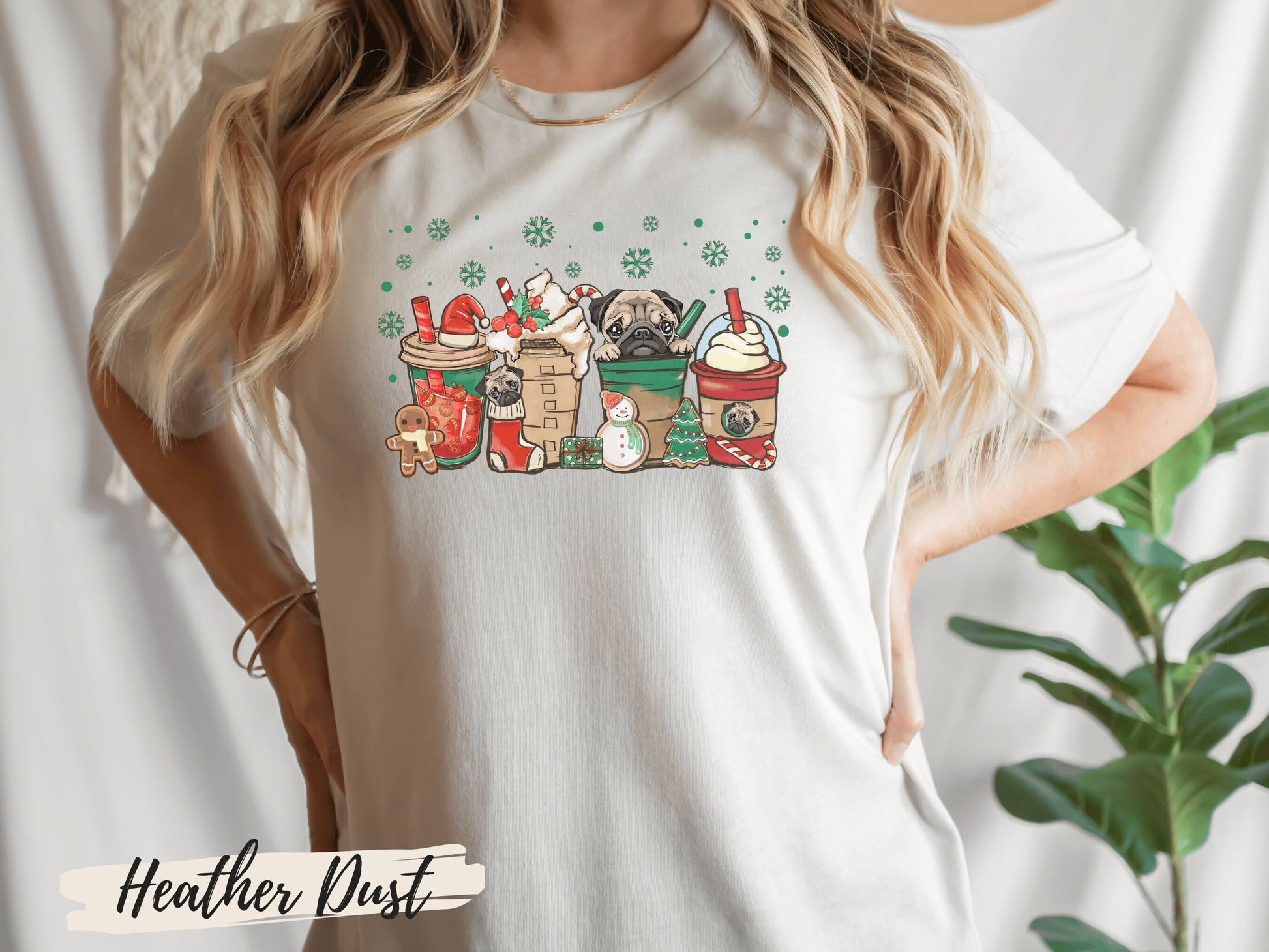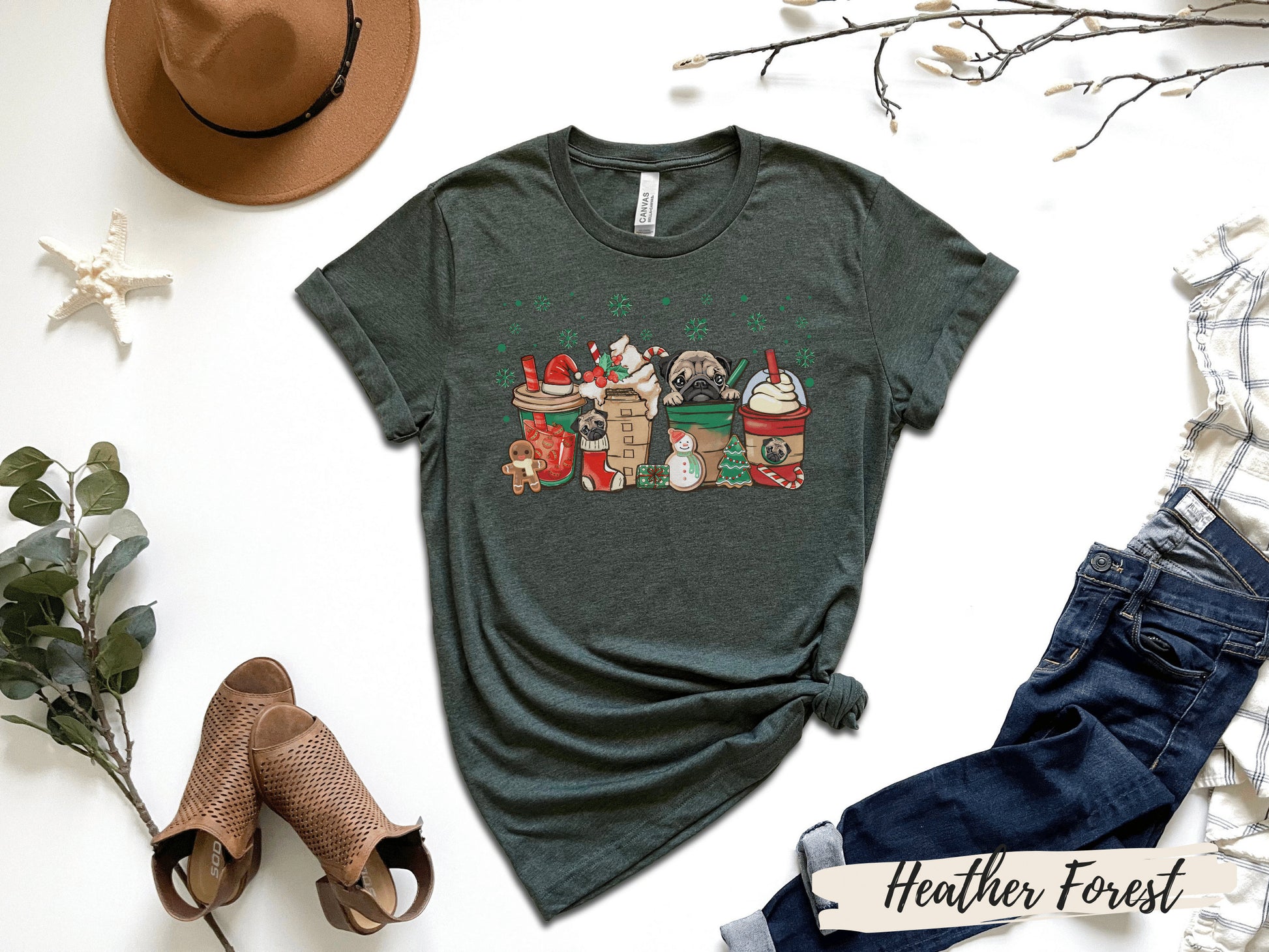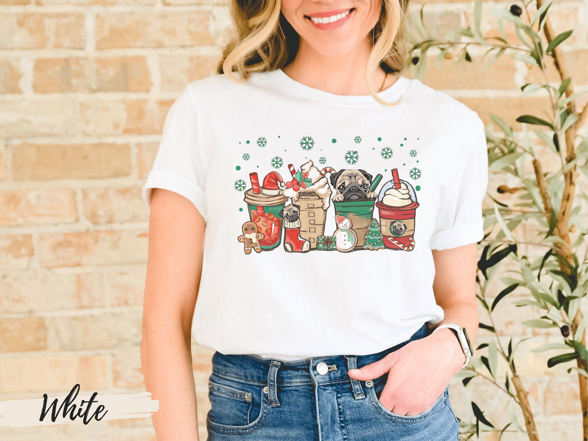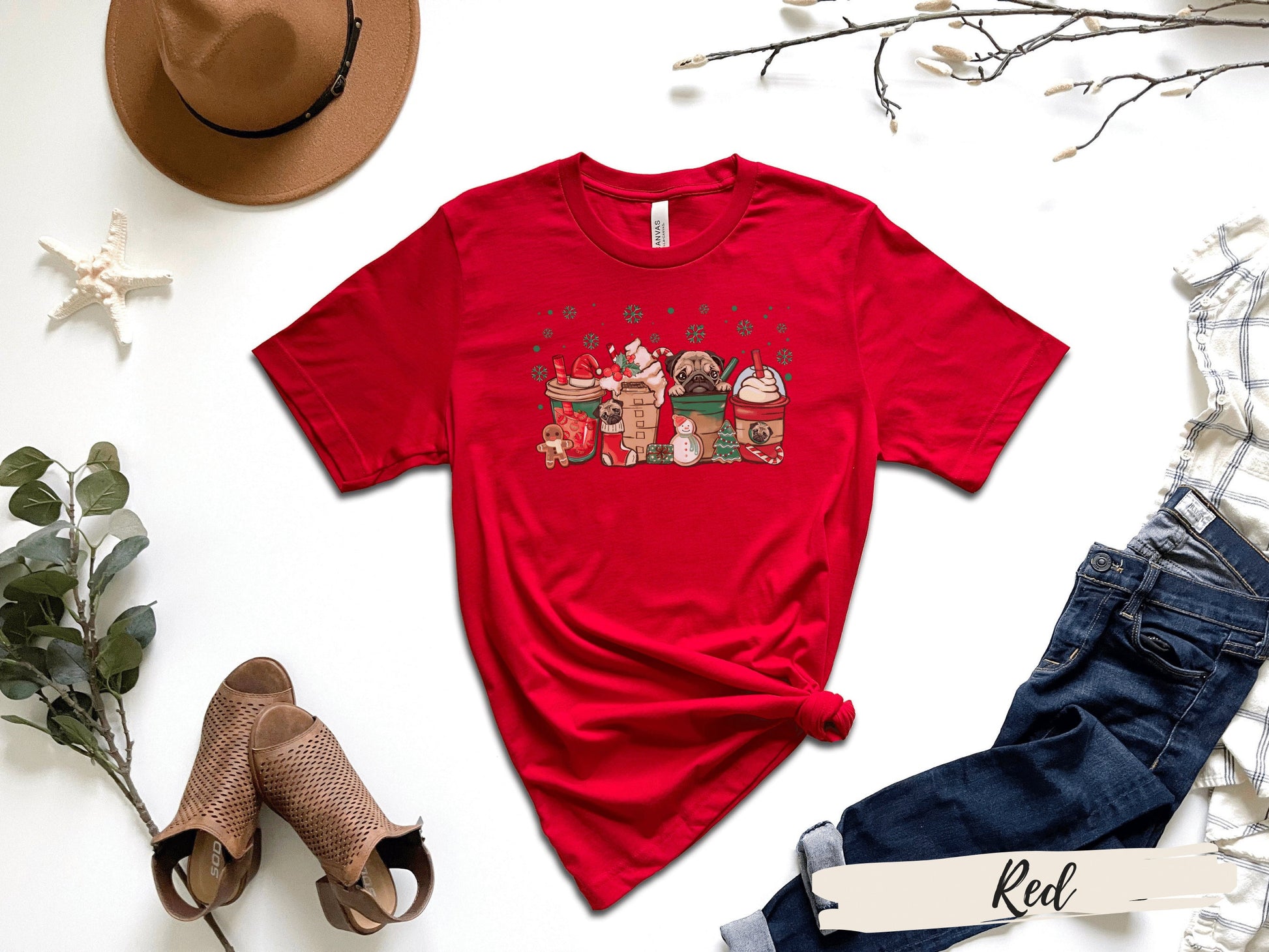 Whether you're sipping coffee at home or heading out for holiday festivities, this shirt is a delightful choice. It makes an excellent gift for dog moms and coffee enthusiasts alike, ensuring that your love for pugs shines through this festive season.