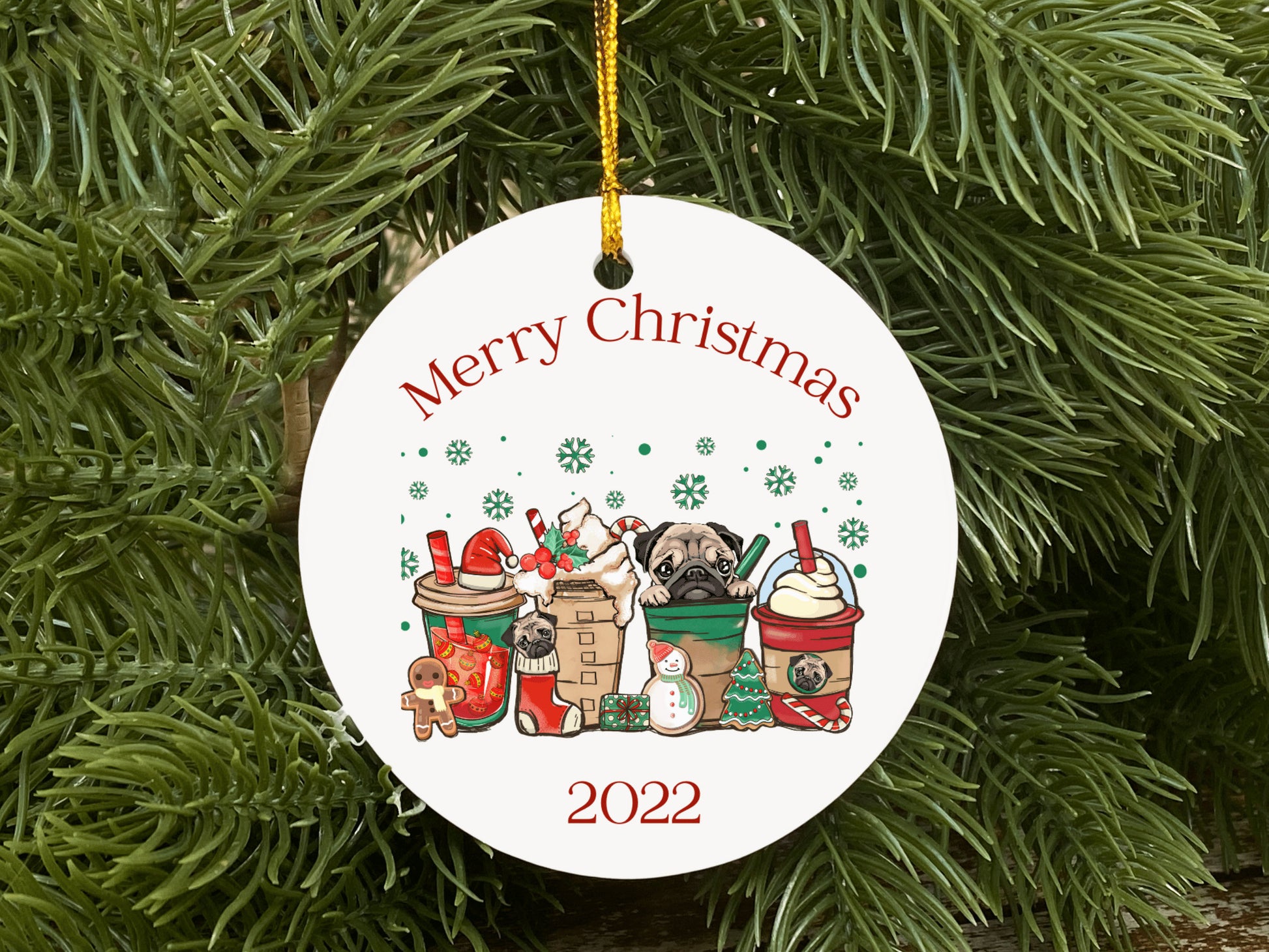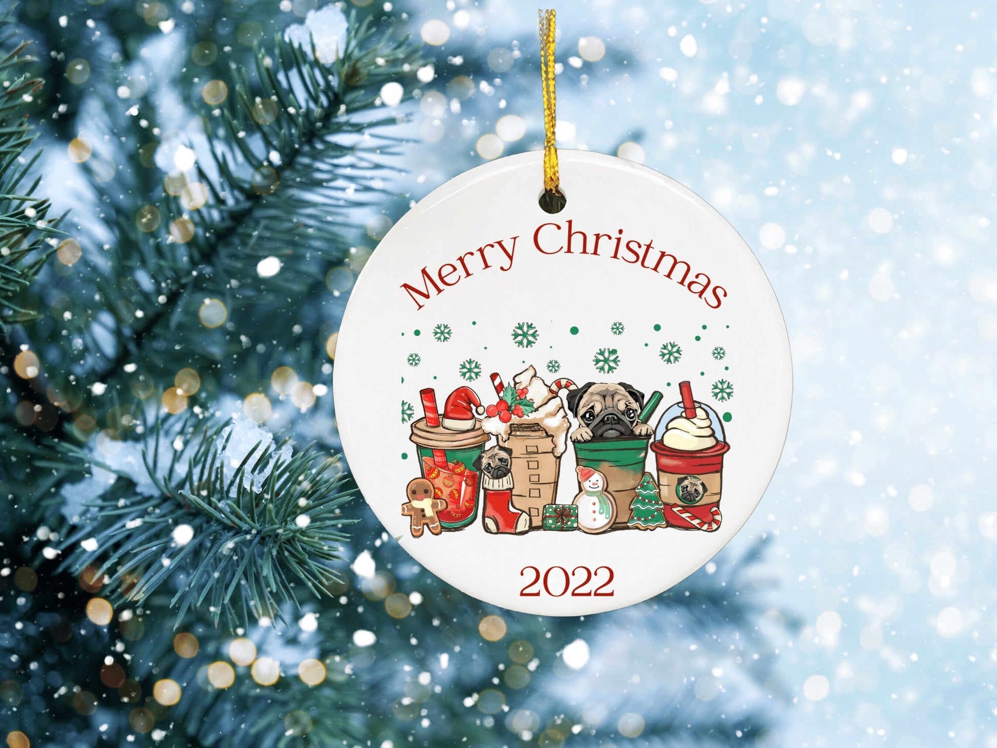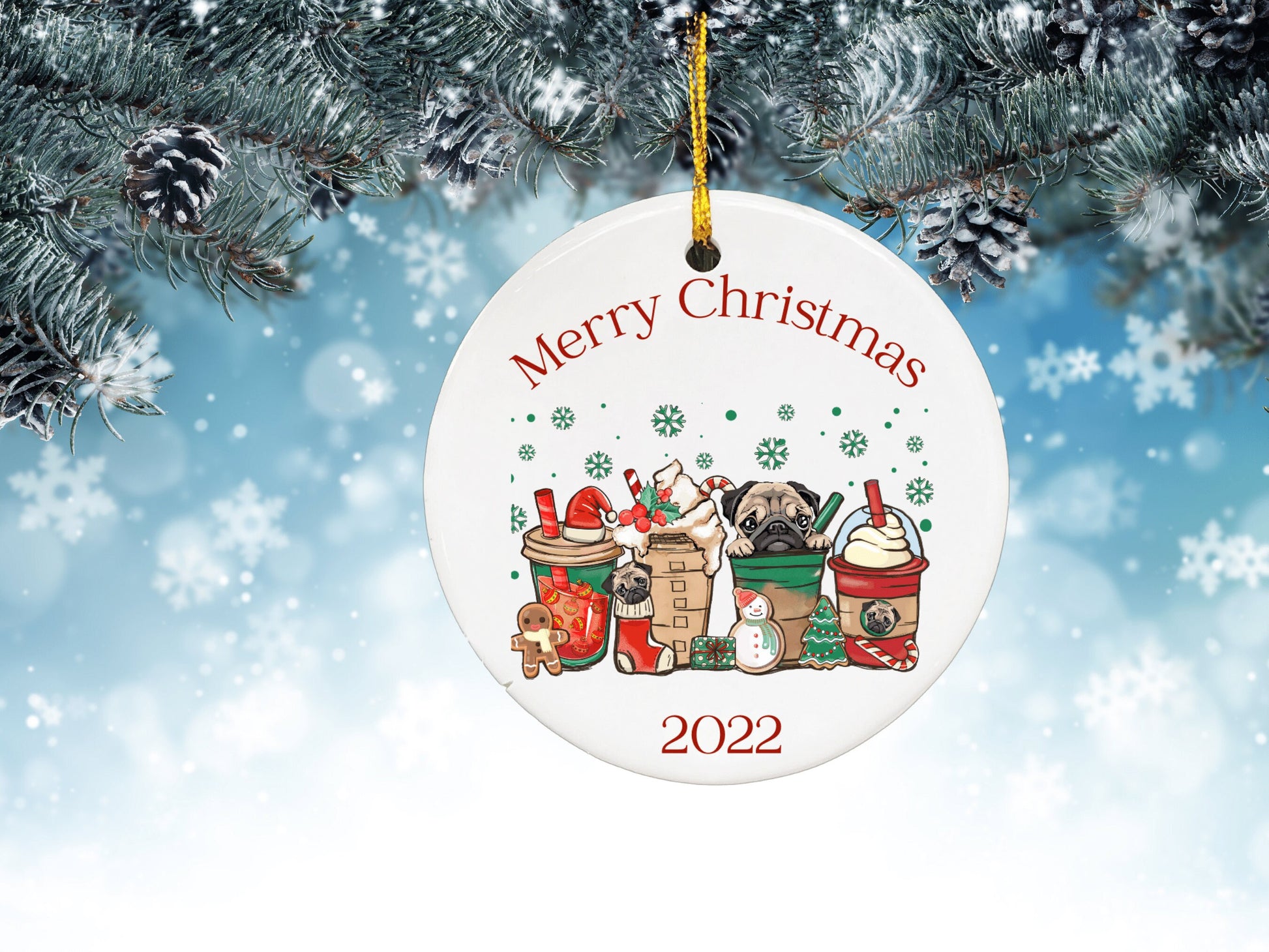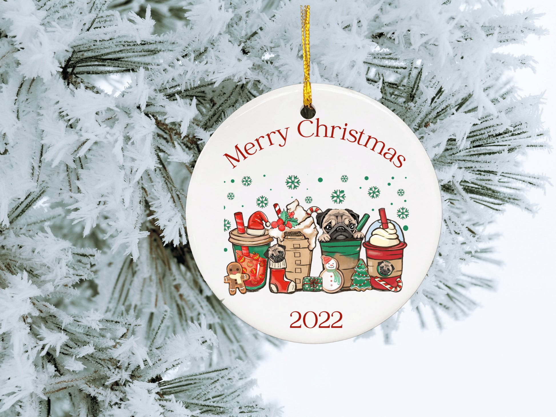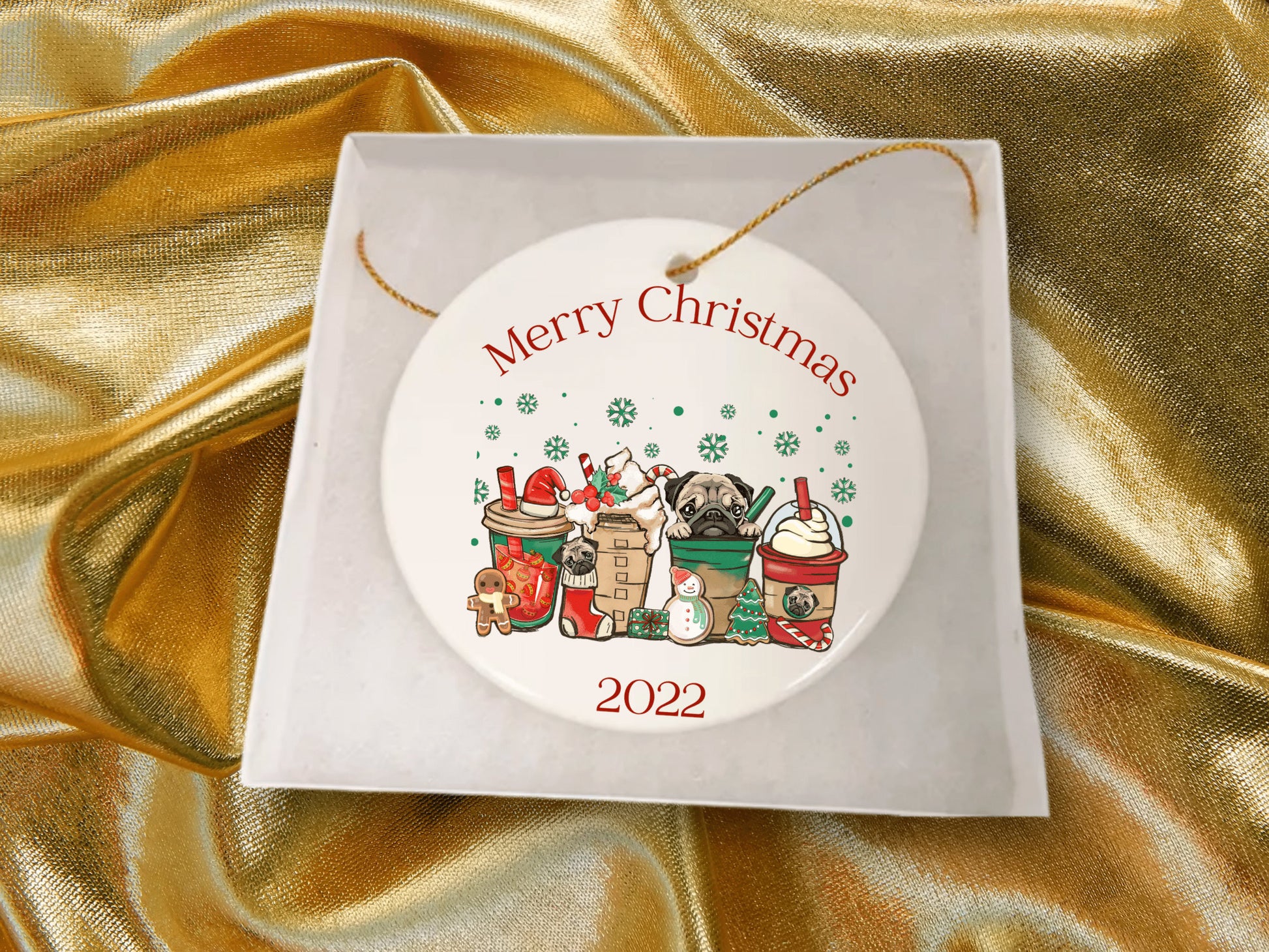 This personalized pug Christmas ornament is too adorable for words! It features a precious pugs peaking out of coffee cups, surrounded by snow flakes and holiday cookies. The personalization option on the front and back of the ornament makes it even more special. This would make a great gift for any pug lover on your list!