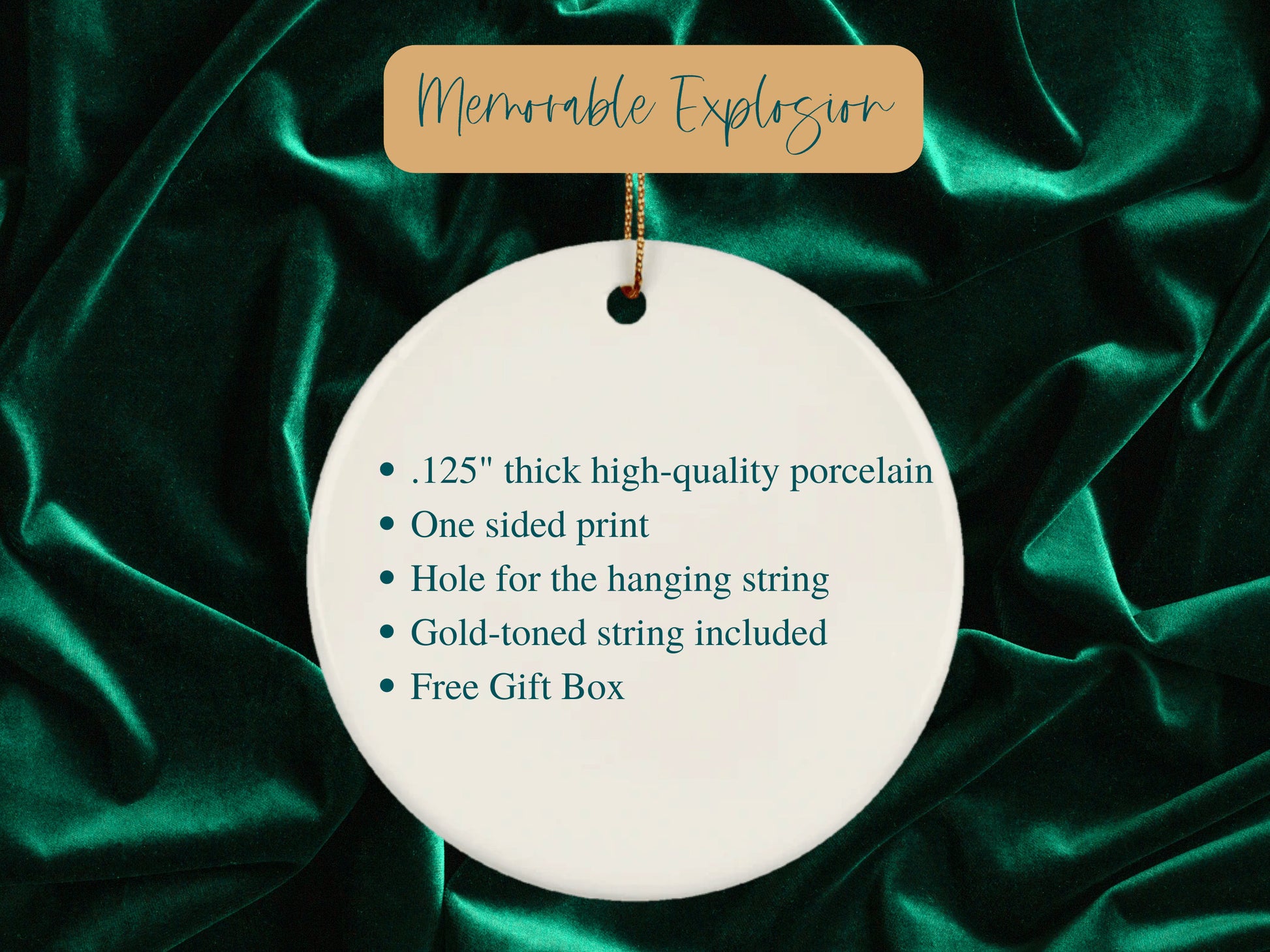Your personalized design is permanently printed on a flat round ceramic ornament which approximately measures 2.85”- 3". Ornament includes a gold ribbon string for hanging and white gift box secured with a transparent lid. This makes for effortless gift giving!