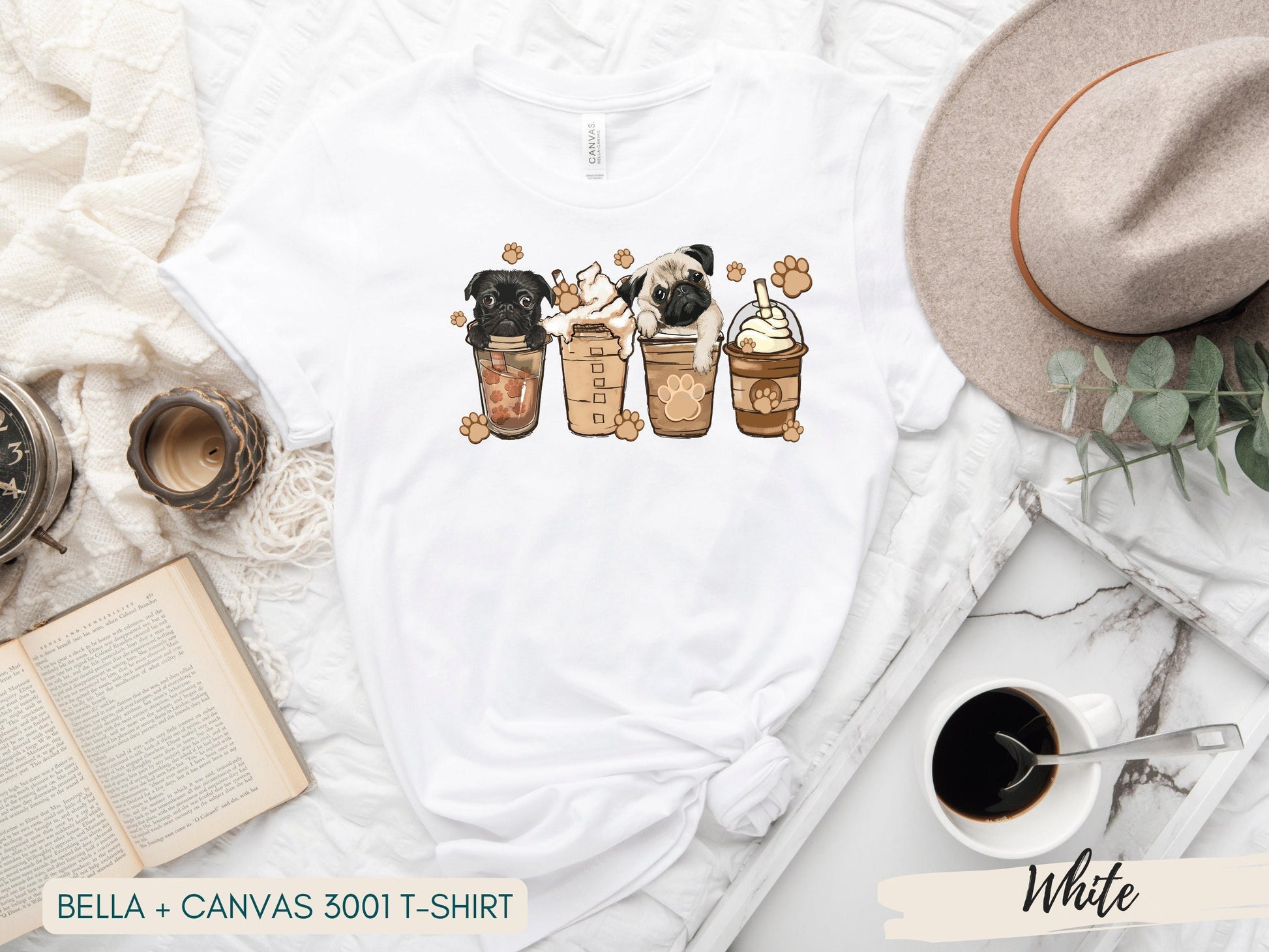 ```Get ready to fall in love with this must-have Pug Shirt! The perfect blend of cuteness and caffeine, our graphic tee features an adorable sable and black pug cozily sitting among coffee containers. Made from super soft cotton, this t-shirt will keep you comfortable all day long.