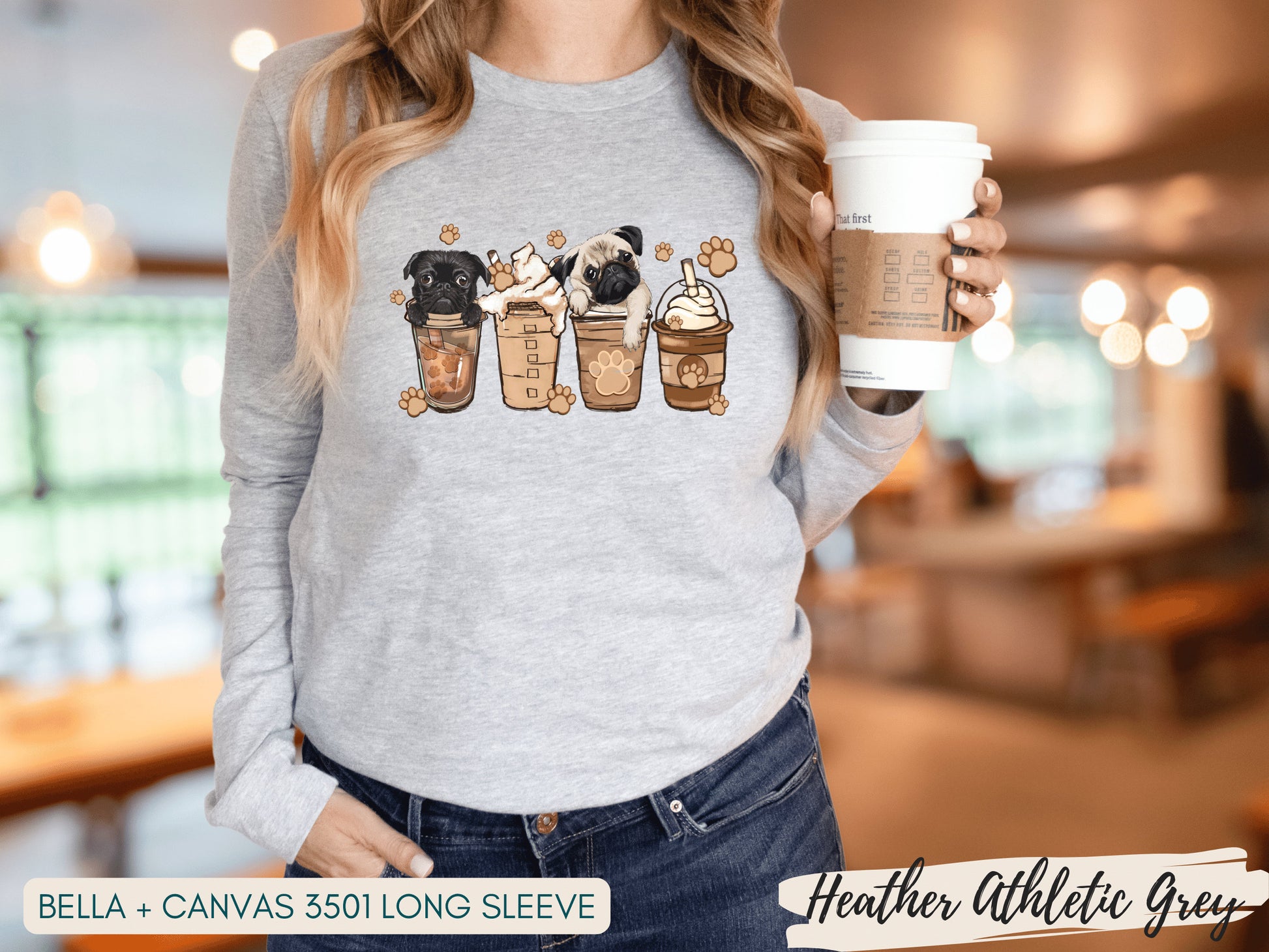 Introducing the Pug Lover Shirt, a delightful addition for any dog mom! This charming graphic tee showcases an adorable sable and black pug nestled among coffee containers, perfectly blending cuteness with your love for caffeine.
