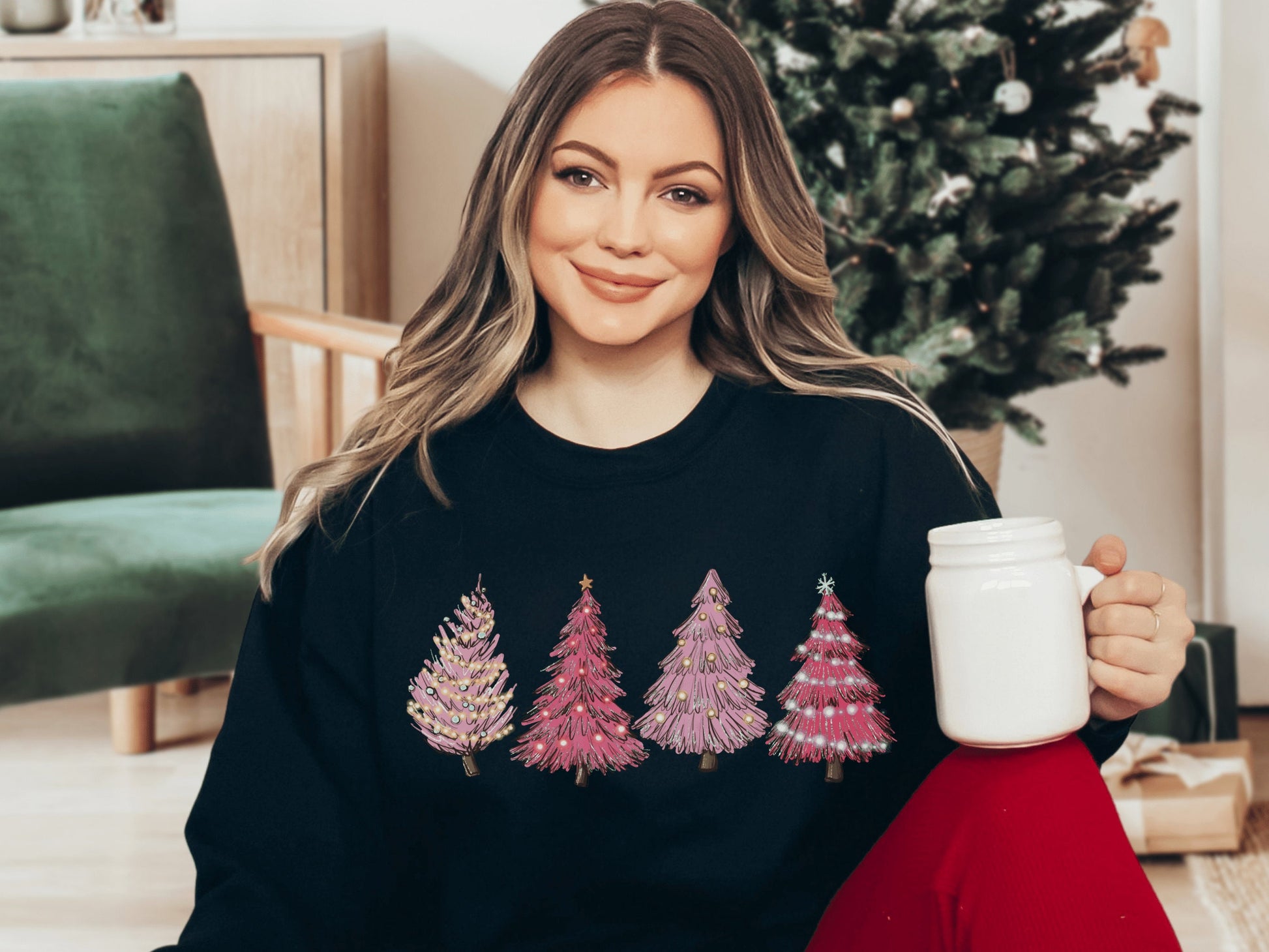 Introducing the Women's Pink Christmas Tree Sweatshirt, a delightful addition to your holiday wardrobe. This cozy sweatshirt features four hand-drawn pink Christmas trees, bringing a festive touch to your outfit.